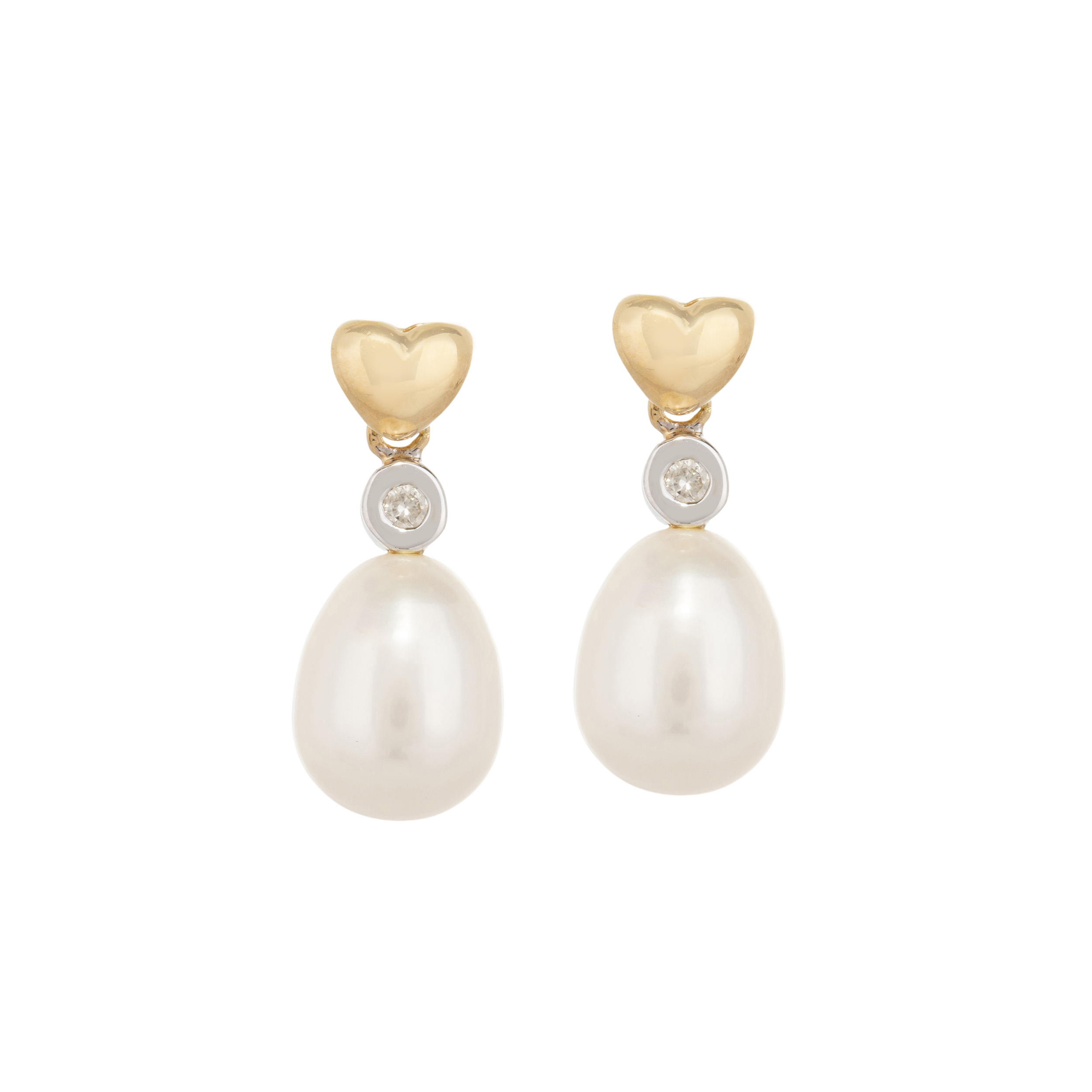 Brinco de ouro amarelo e branco com pérolas (7,1mm) e 0,04ct de brilhantes. Medida 1,7cm.