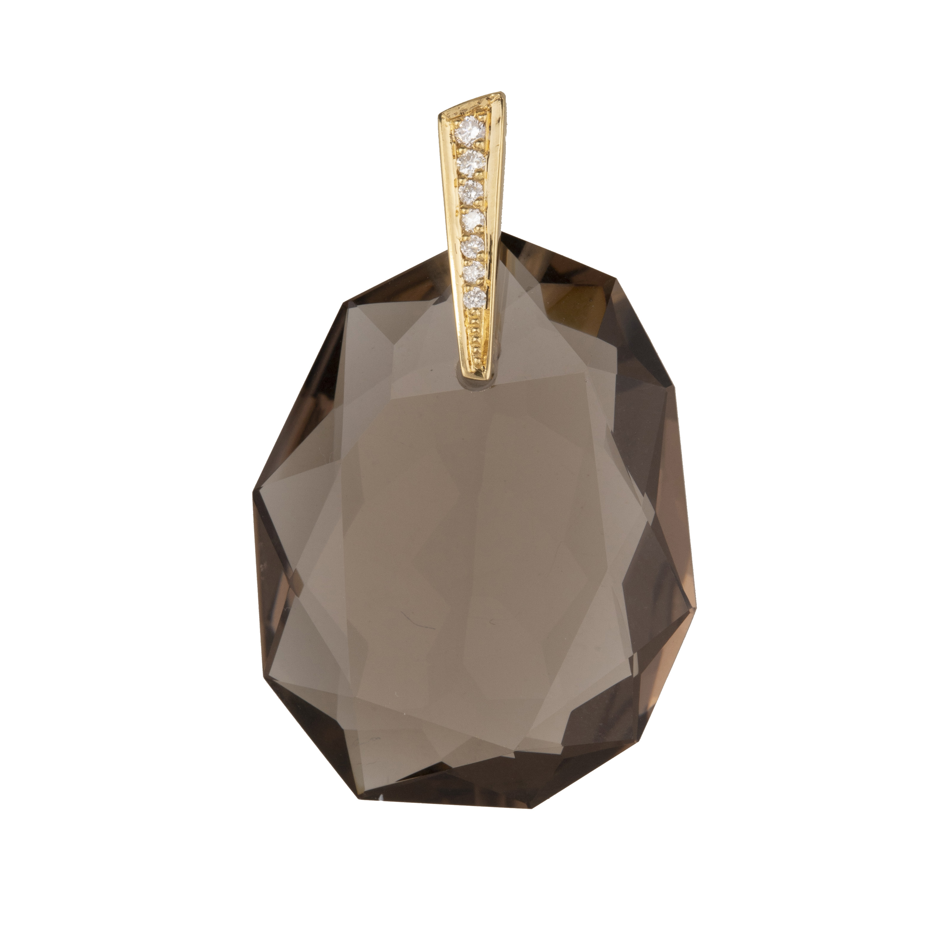 Pingente de ouro amarelo com quartzo fumê, 0,10ct de brilhantes e 8,3g. Medida 3,8cm.