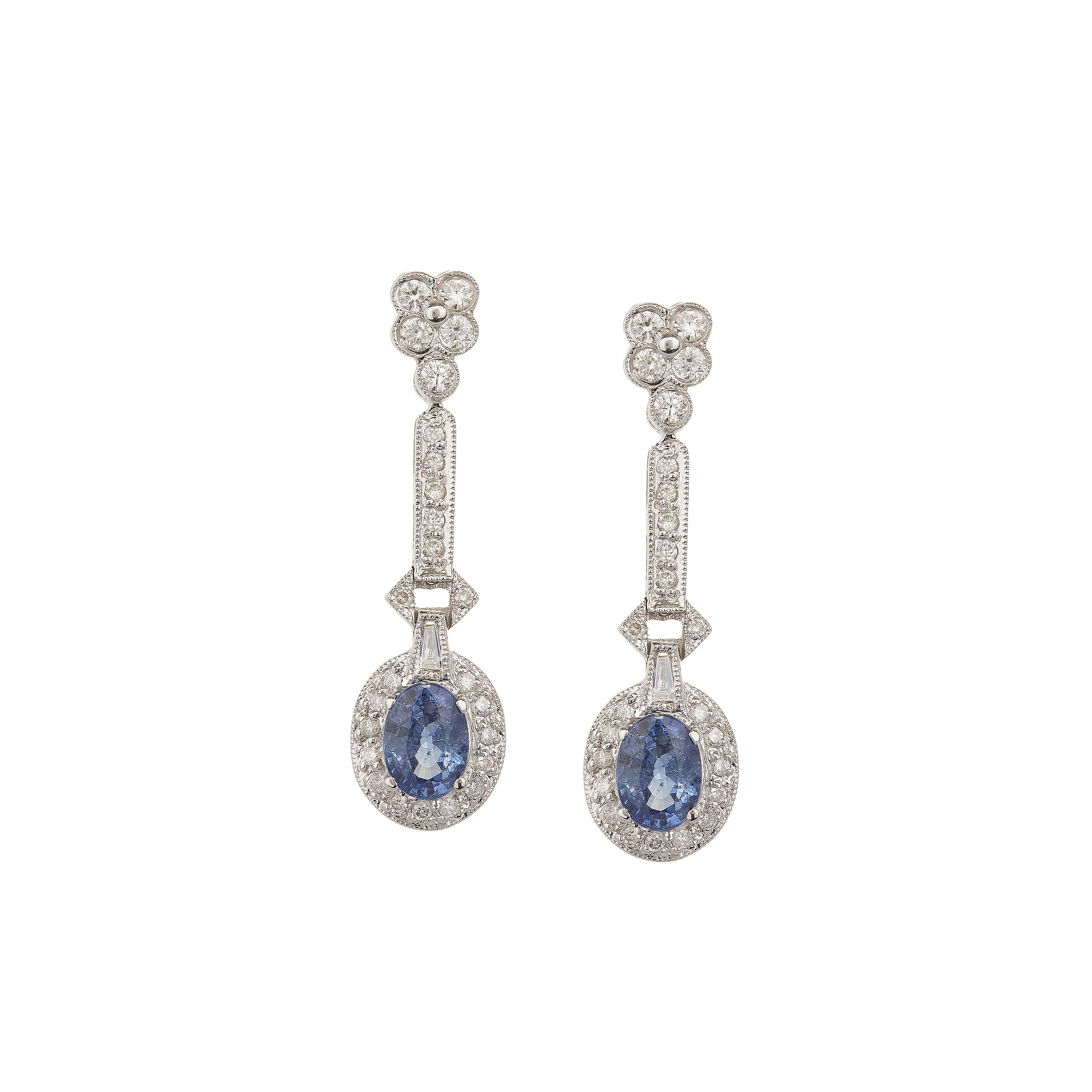 Brinco de ouro branco com 1,82ct de safiras, 0,70ct de brilhantes e 6,6g. Medida 3,2cm.
