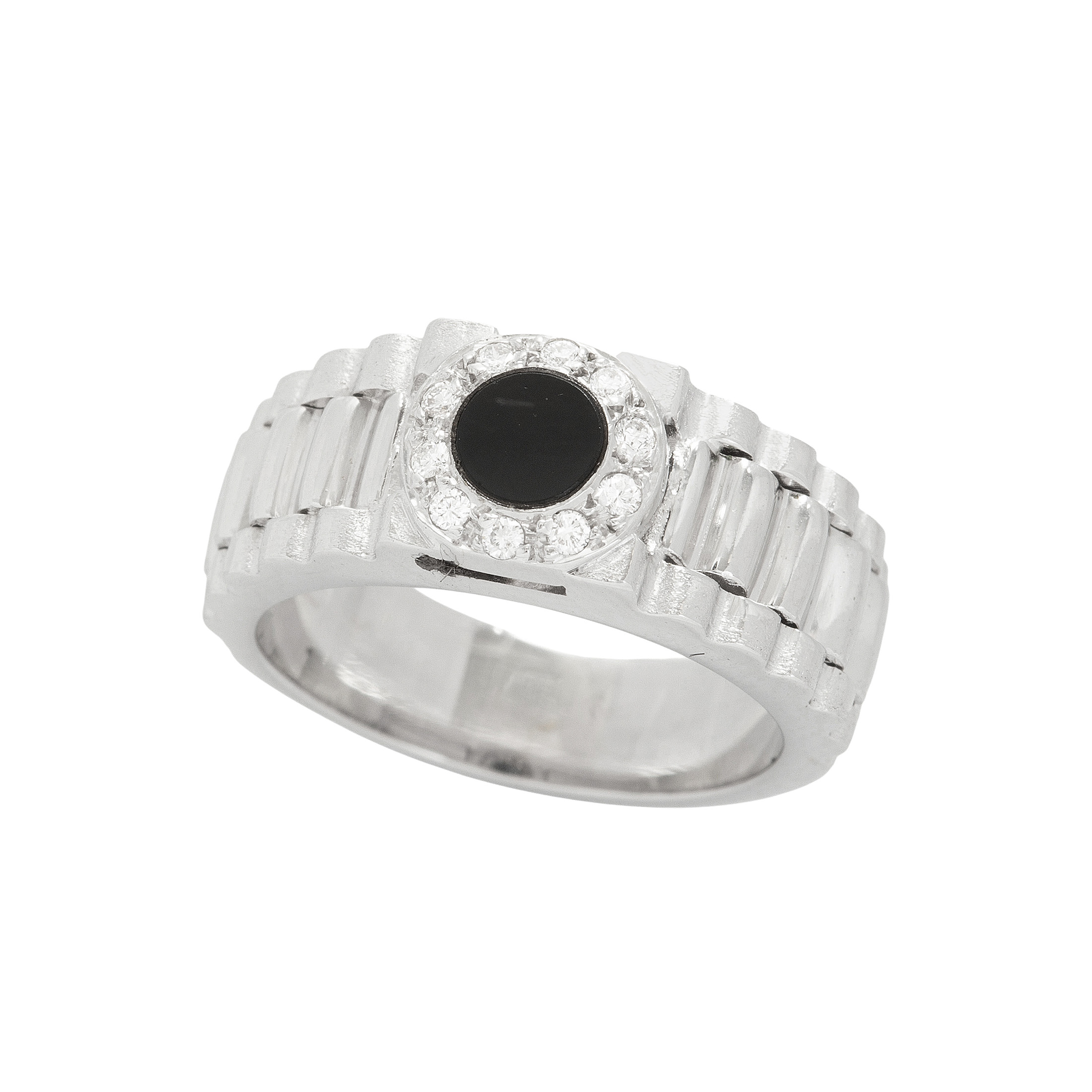 Anel de ouro branco com onix, 0,08ct de brilhantes e 8,7g. Medida 13.