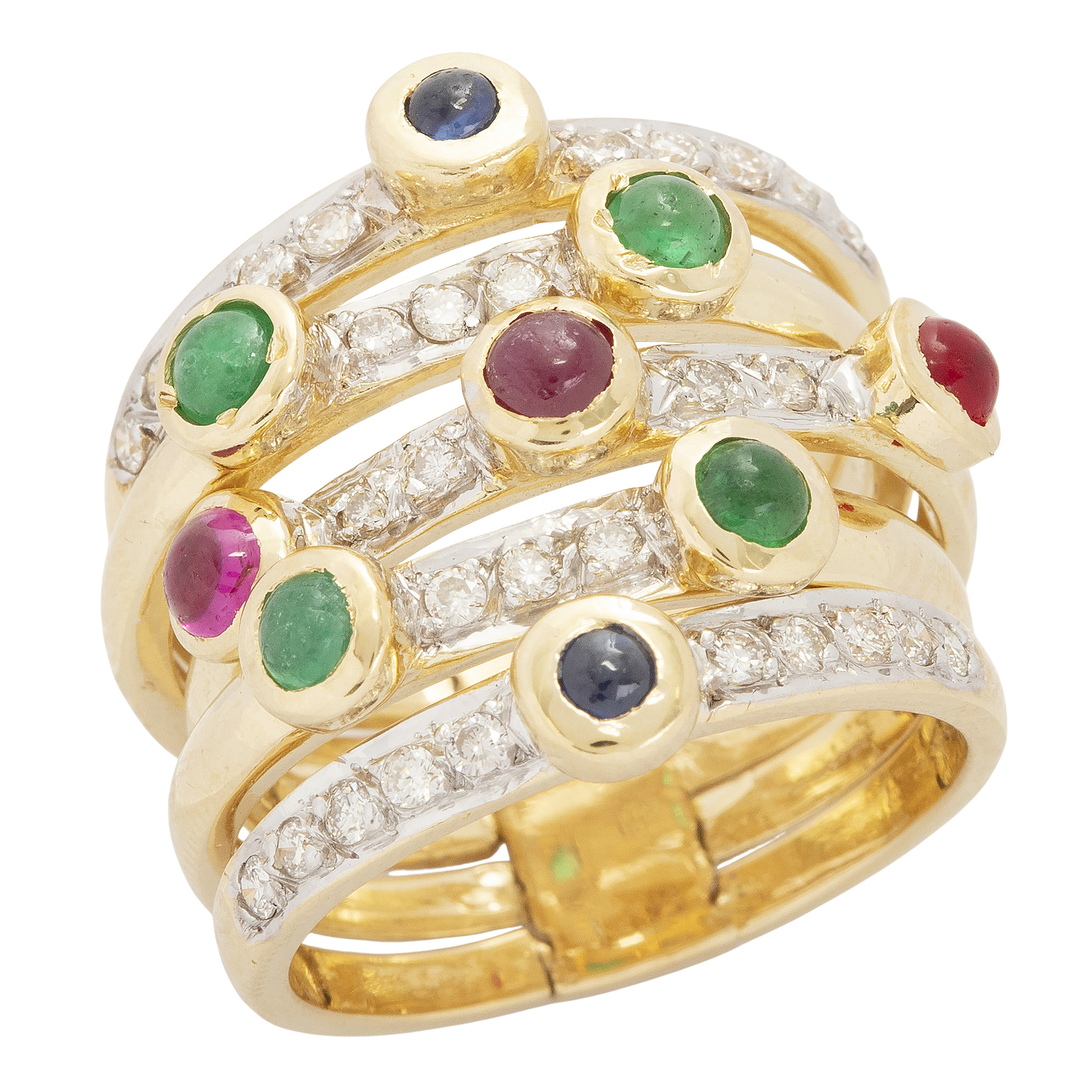 Anel de ouro amarelo com safiras, rubis, esmeraldas, 0,45ct de brilhantes e 18,2g. Medida 18.