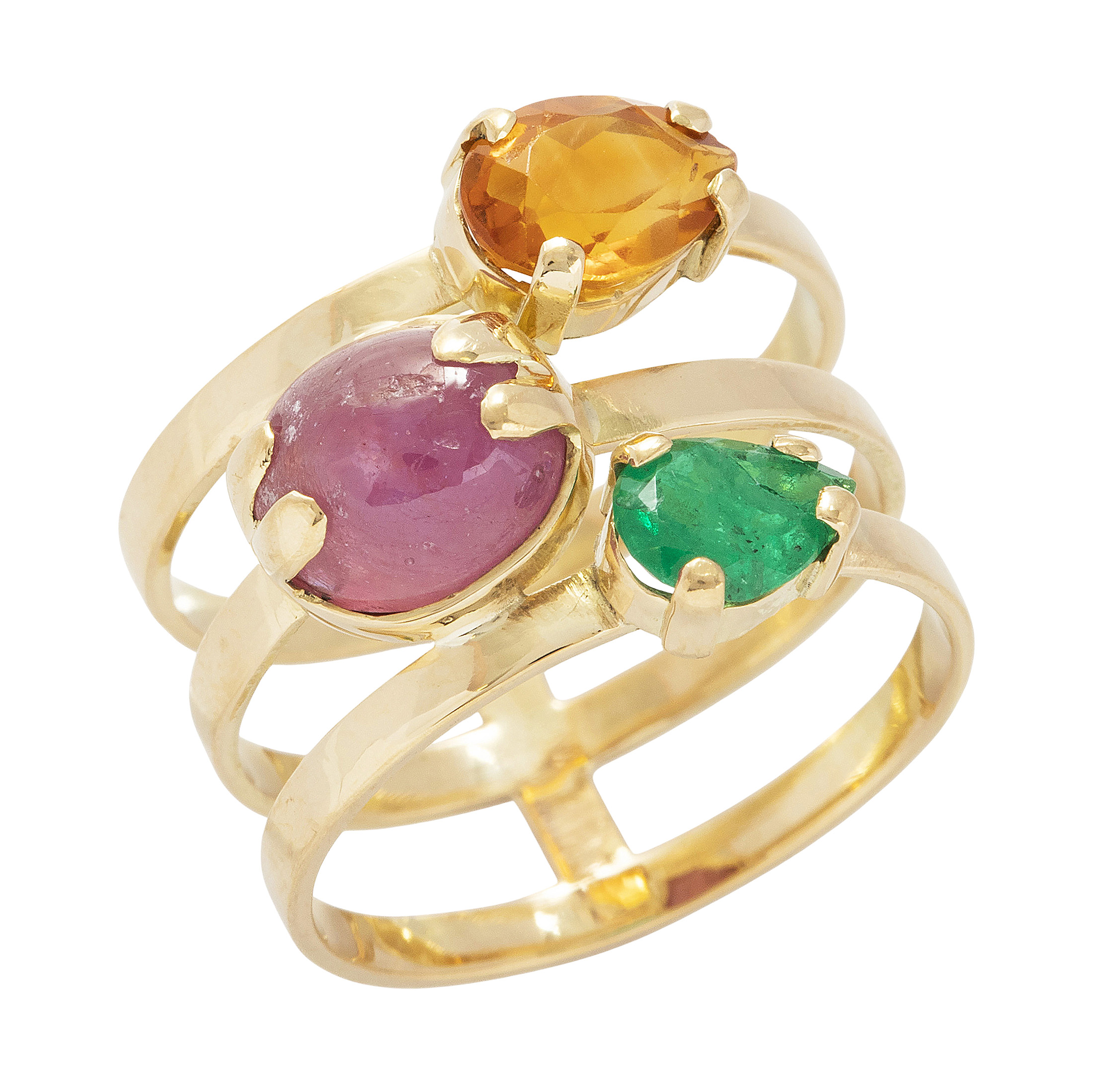 Anel de ouro amarelo com rubi, citrino e esmeralda. Medida 14.