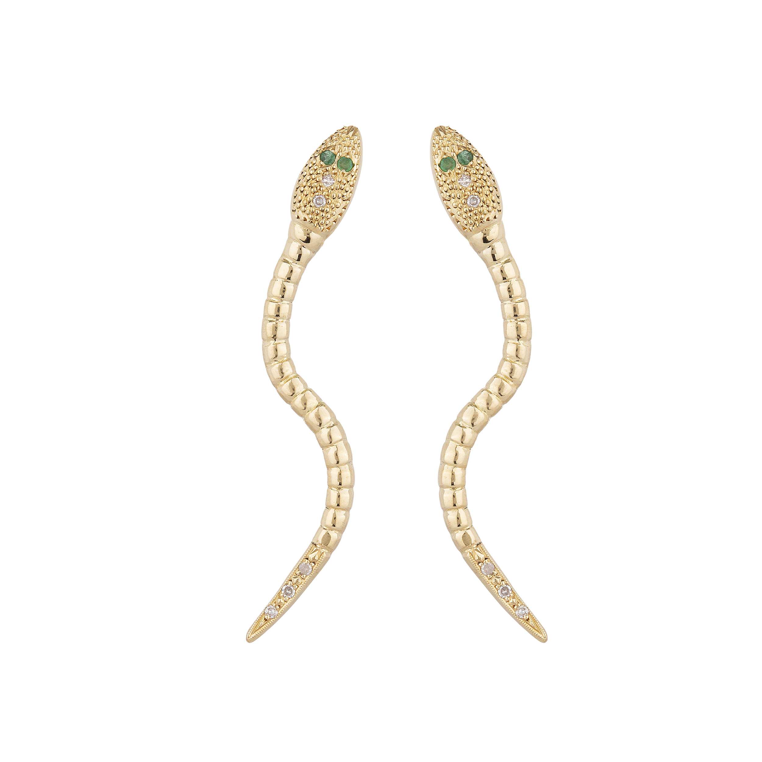 Brinco de ouro amarelo com esmeraldas, 0,02ct de brilhantes e 9,4g. Medida 5,3cm.