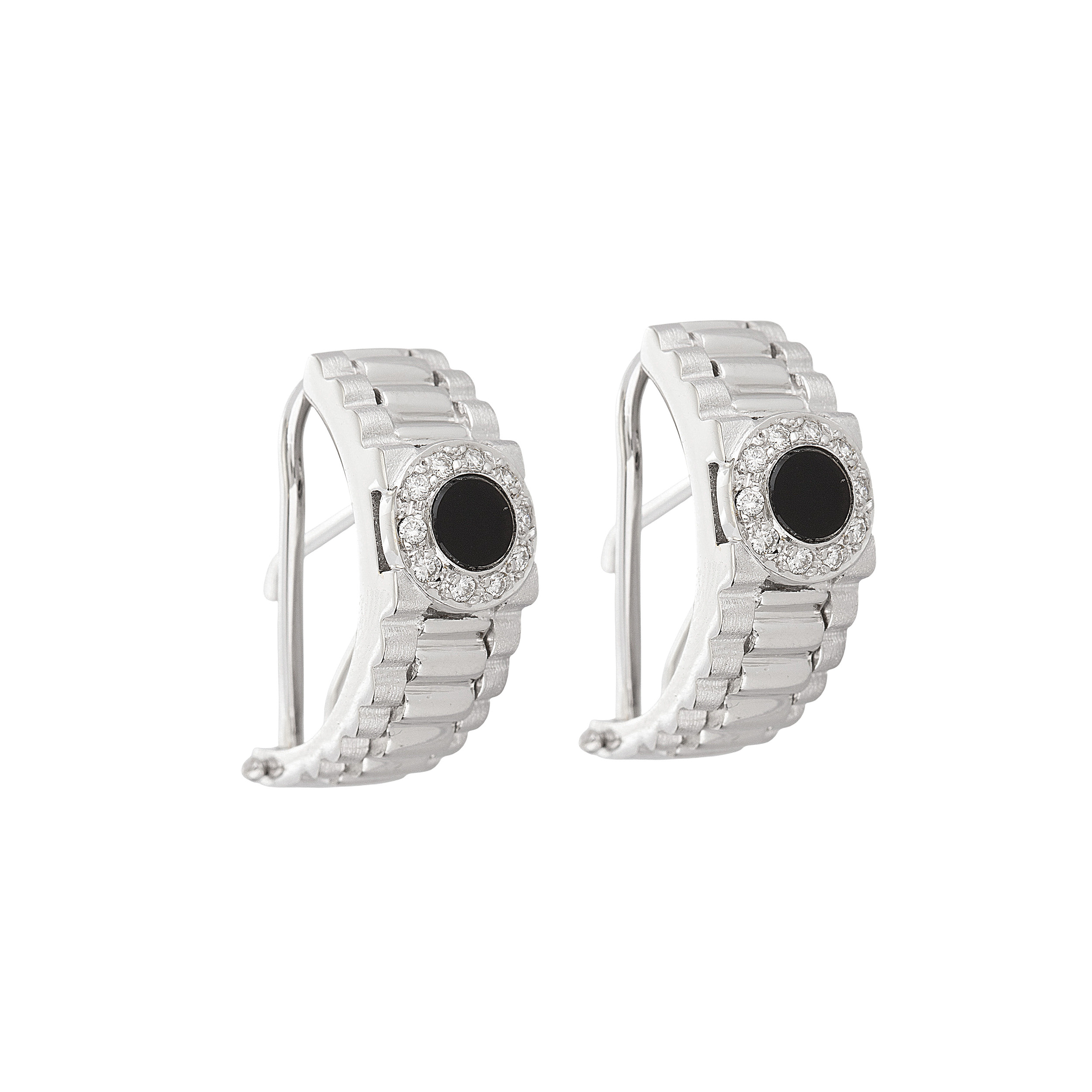 Brinco de ouro branco com onix, 0,08ct de brilhantes e 15,1g. Medida 1,2cm.