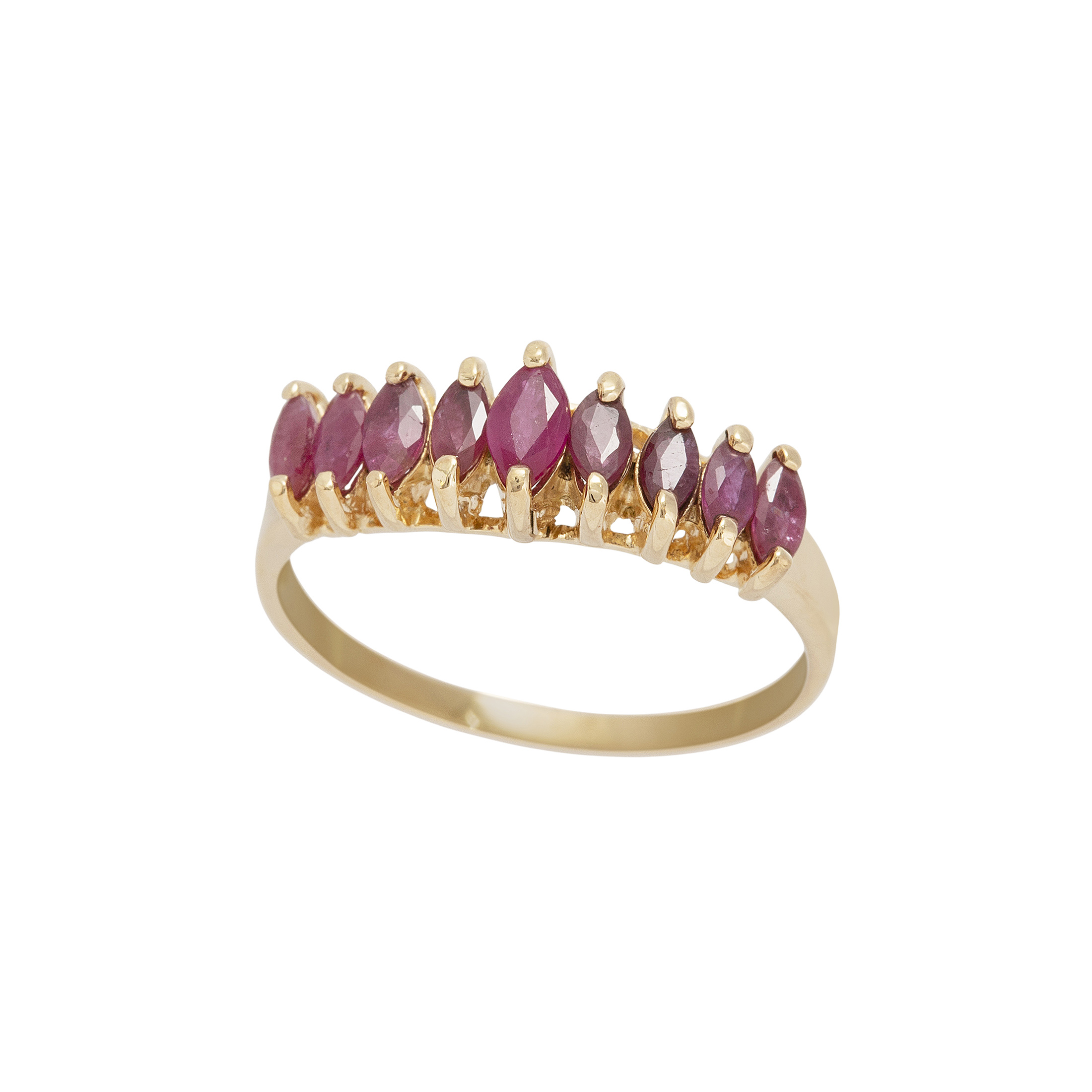 Meia-aliança de ouro amarelo com rubis. Medida 18.