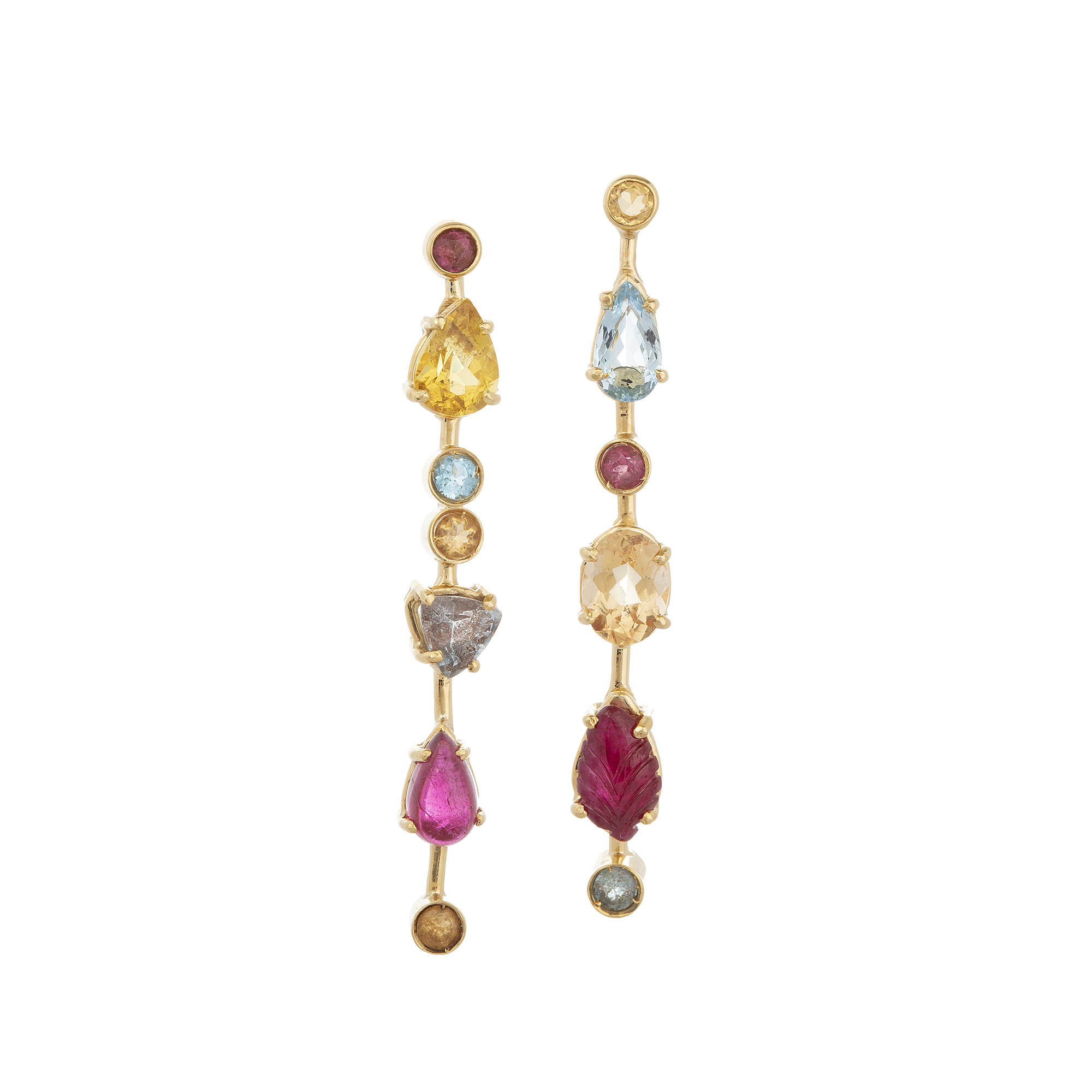 Brinco de ouro amarelo com citrinos, berilos, topázios, rubis, turmalinas rosa e 10,0g. Medida 5cm.