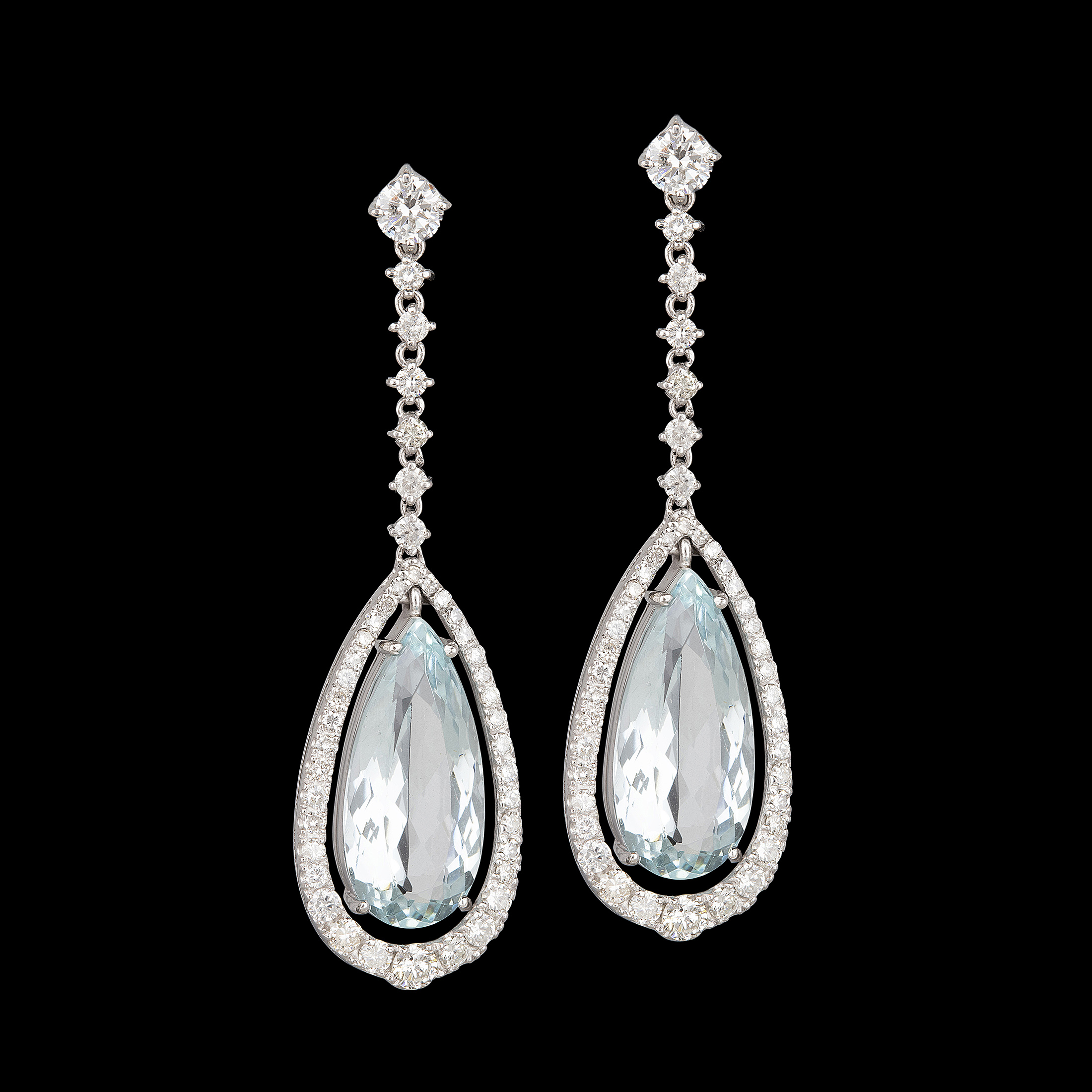 Brinco de ouro branco com 12,65ct de águas-marinhas, 2,39ct de brilhantes I-J/SI e 11,6g. Medida 4,5cm.