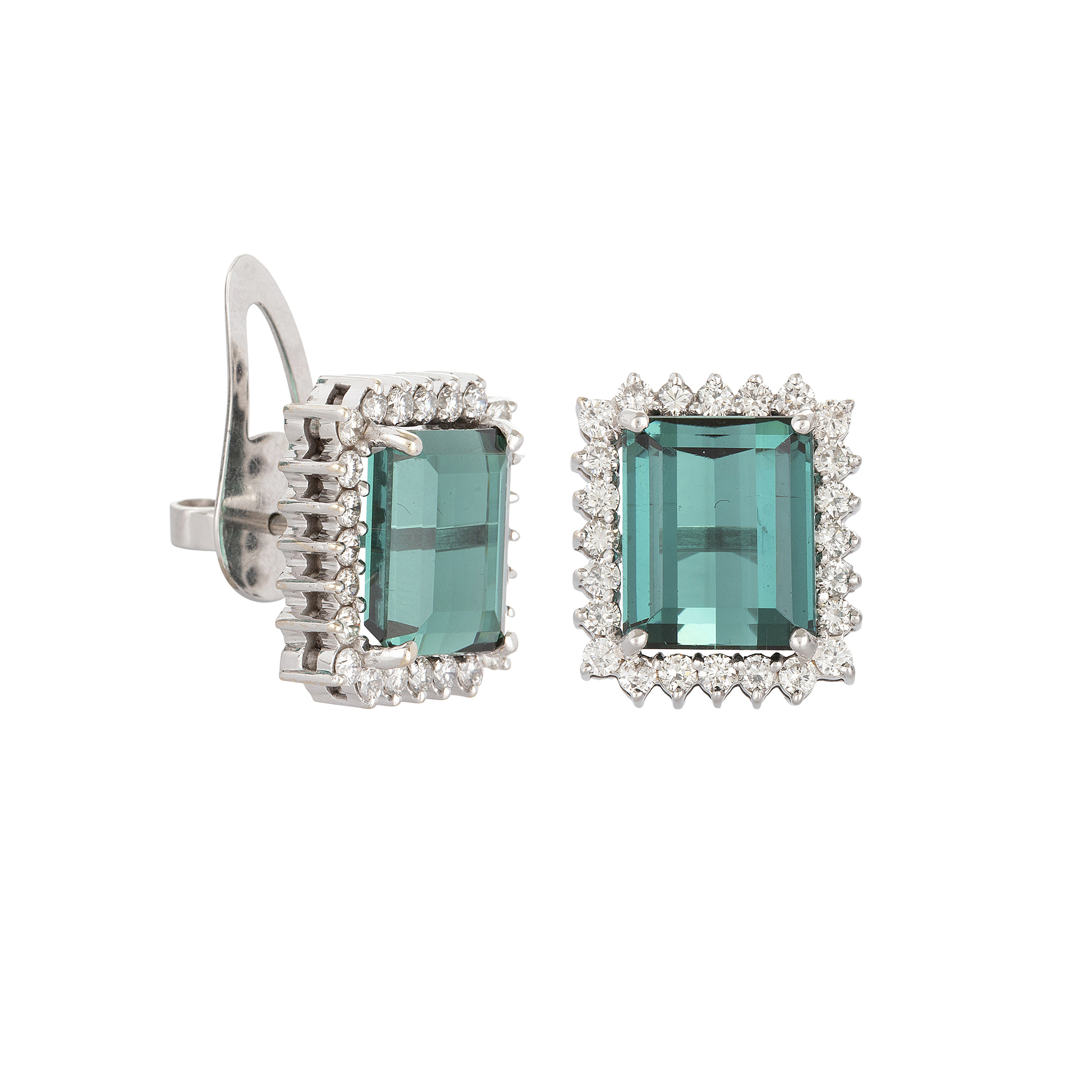 Brinco de ouro branco com 10,40ct de turmalinas verdes, 1,40ct de brilhantes e 9,1g. Medida 1,4cm.