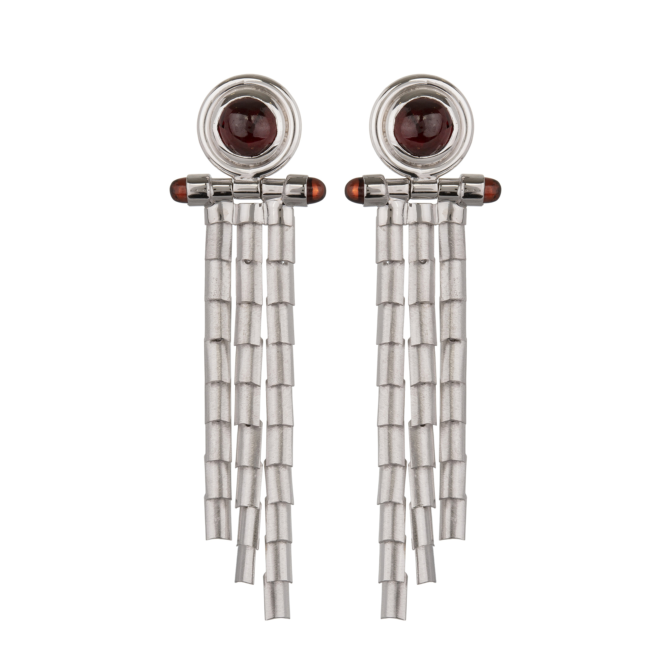 Brinco de ouro branco com granadas e 16,6g. Medida 6,3cm.
