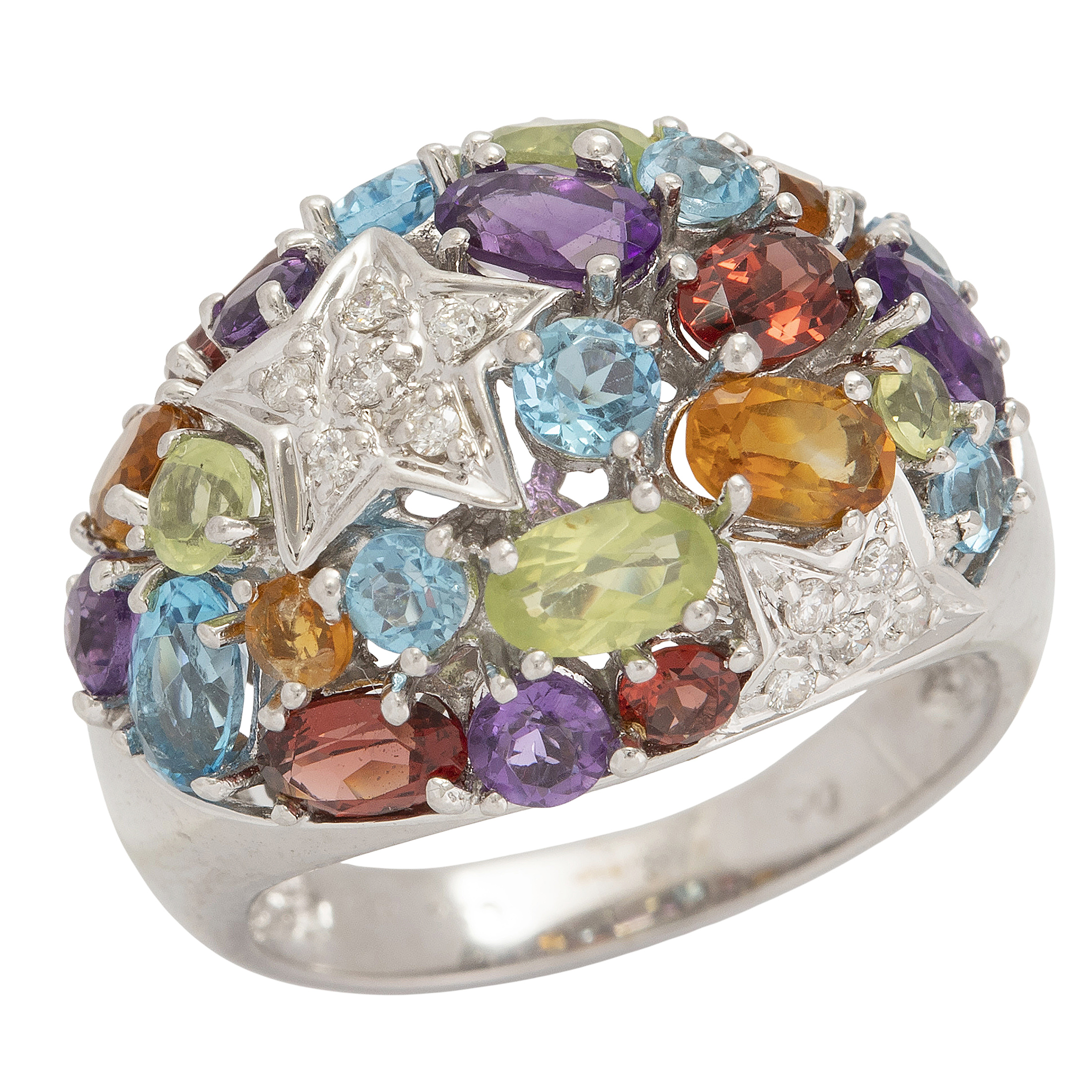 Anel de ouro branco com ametistas, citrinos, peridotos, granadas, topázios, 0,05ct de brilhantes e 7,2g. Medida 14.
