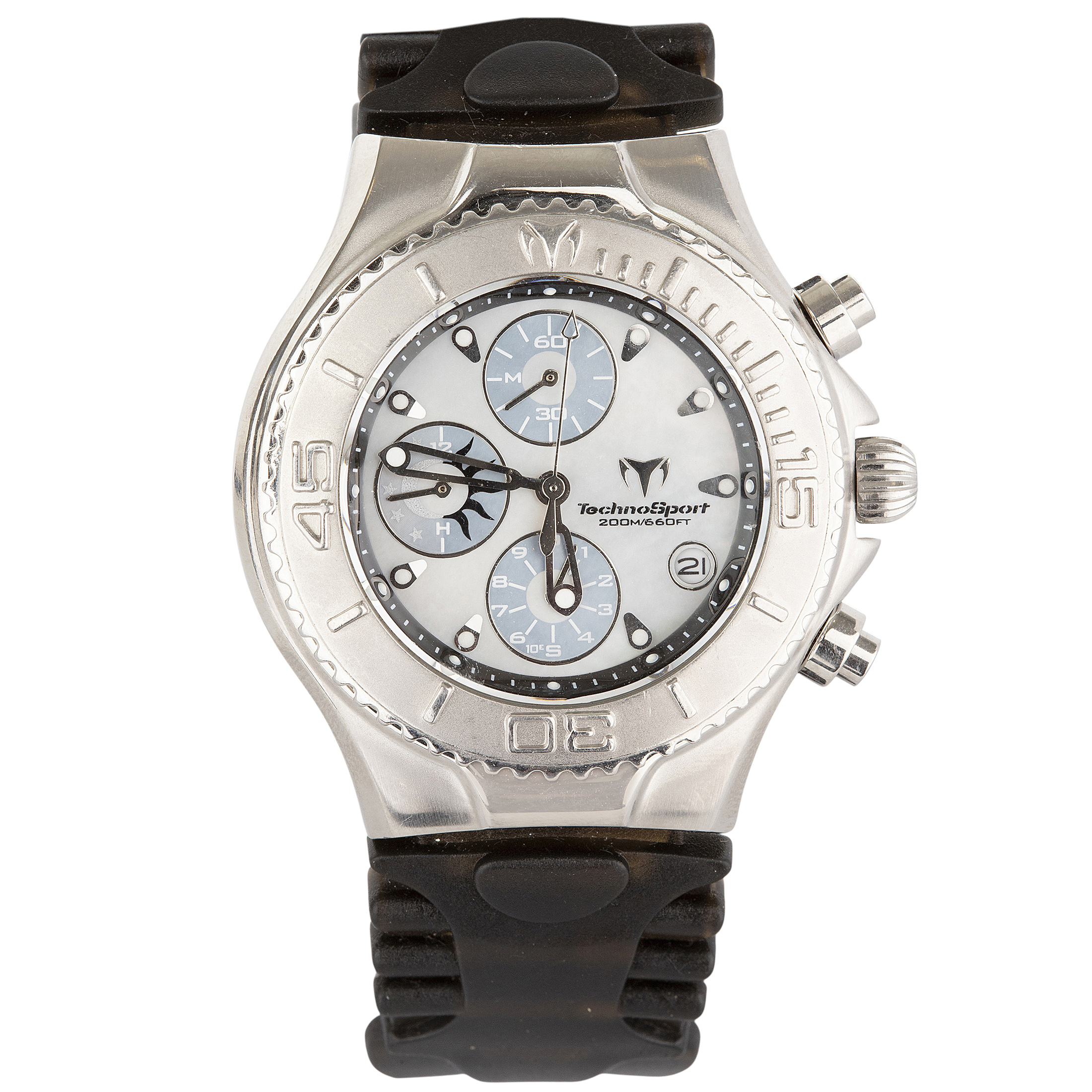 TECHNOSPORT. Relógio de aço com movimento a quartzo, cronógrafo, calendário, vidro de cristal mineral, anos 2000. Caixa 39mm. Pulseira de borracha 21cm.