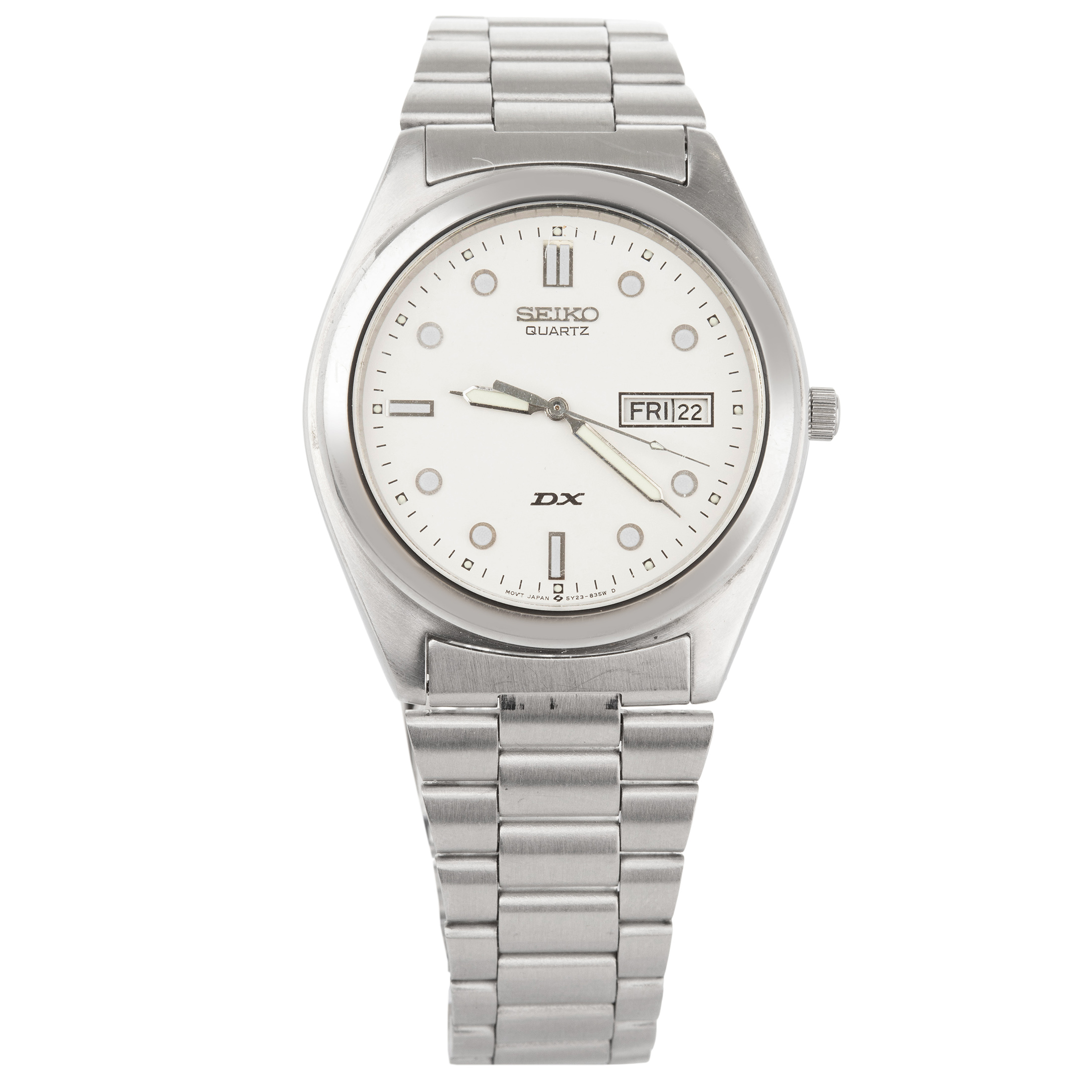 SEIKO. Relógio DX de aço com movimento a quartzo, calendário, vidro de crtistal mineral, anos 2000. Caixa 36mm. Pulseira 22cm.