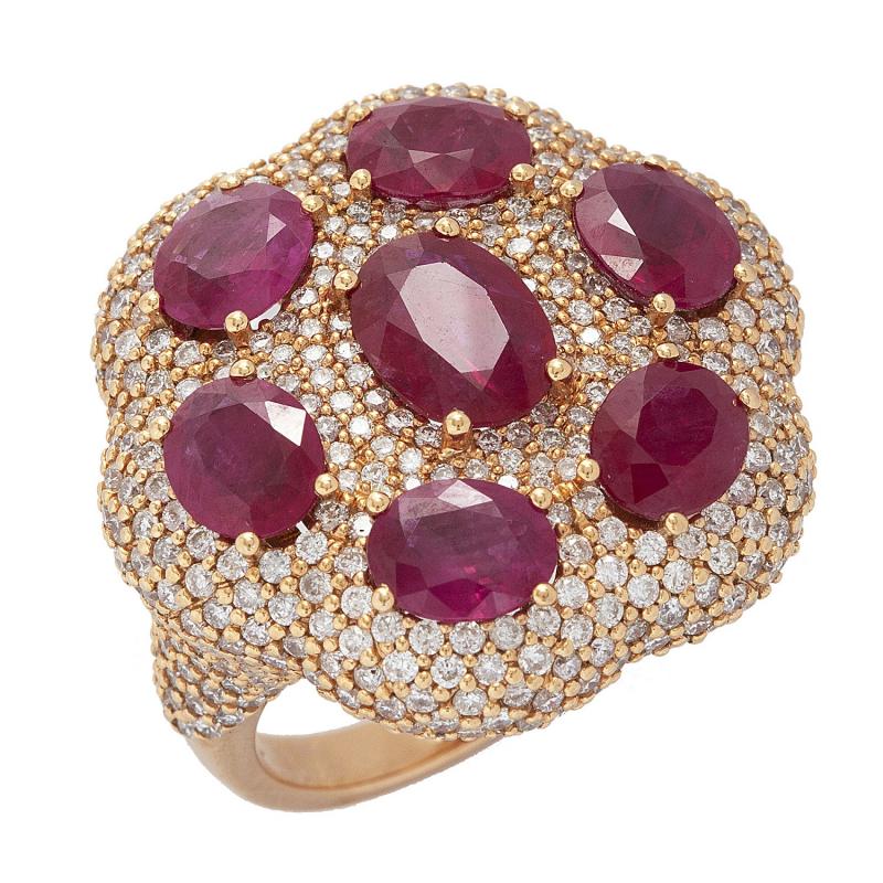 Anel de ouro amarelo com 5,61ct de rubis, 2,93ct de brilhantes I/SI e 12,5g. Medida 16.