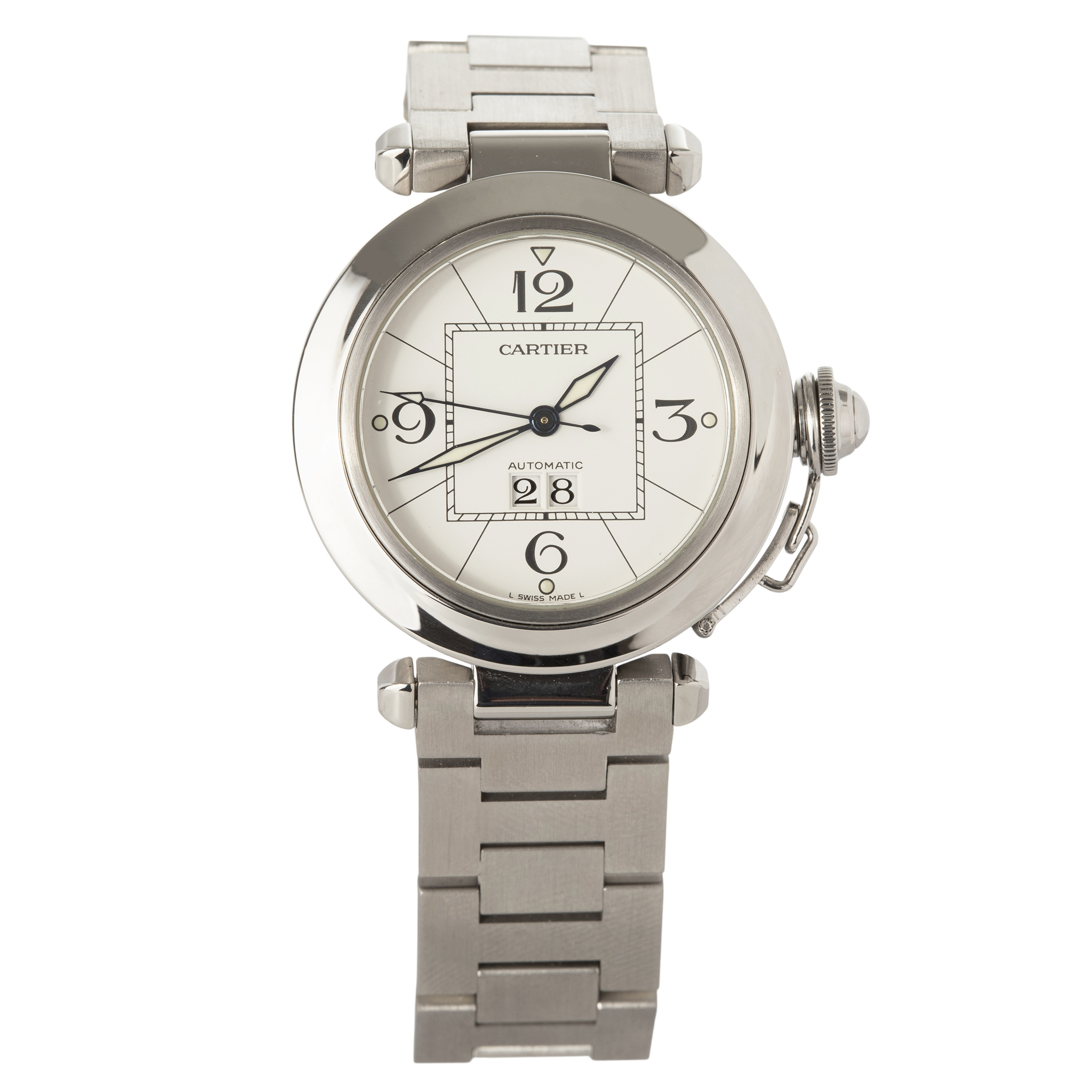 CARTIER. Relógio Pasha de aço com movimento automático, calendário, vidro de safira, anos 2000. Caixa 35mm. Pulseira 16cm.