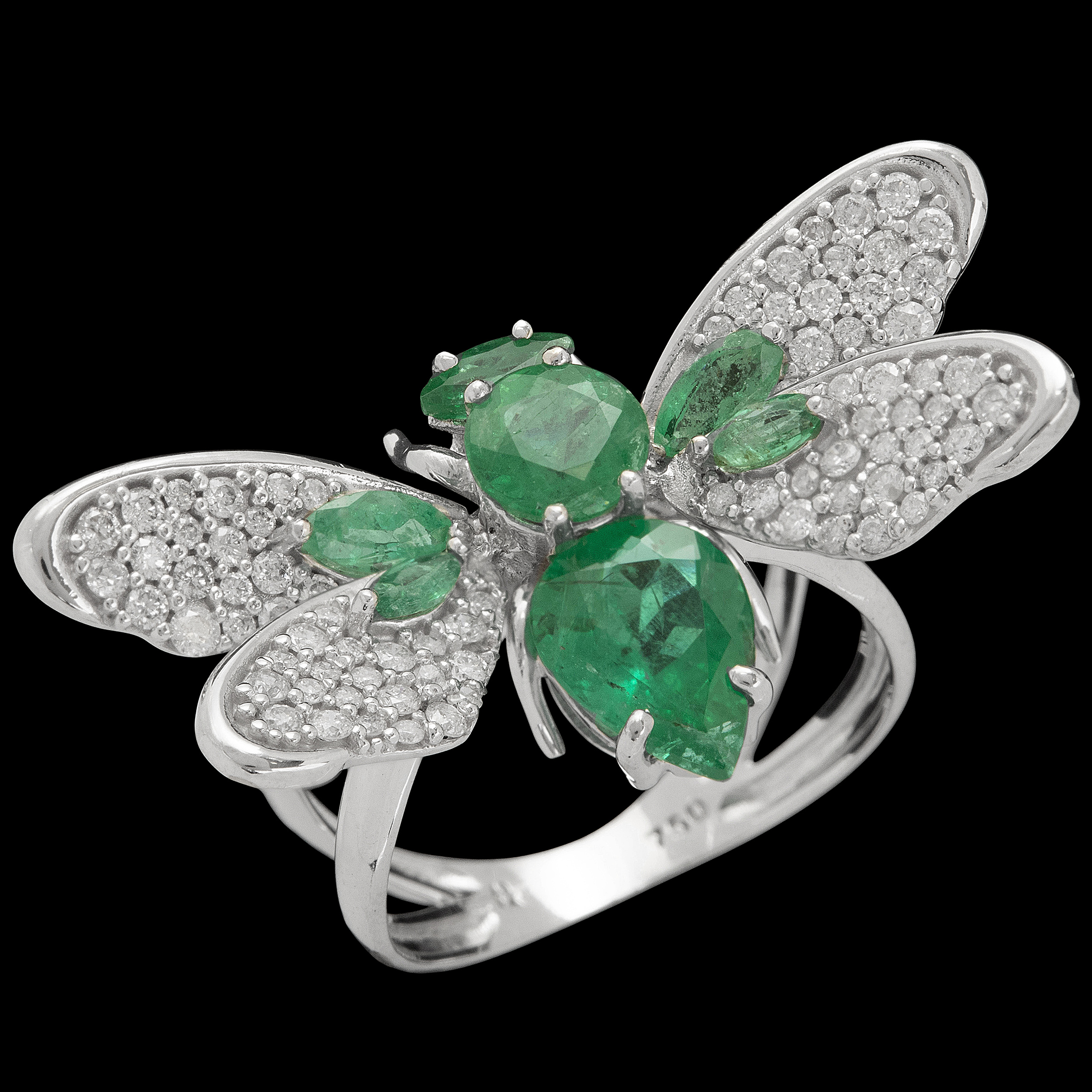 Anel de ouro branco com esmeraldas, 0,57ct de brilhantes e 7,2g. Medida 17.