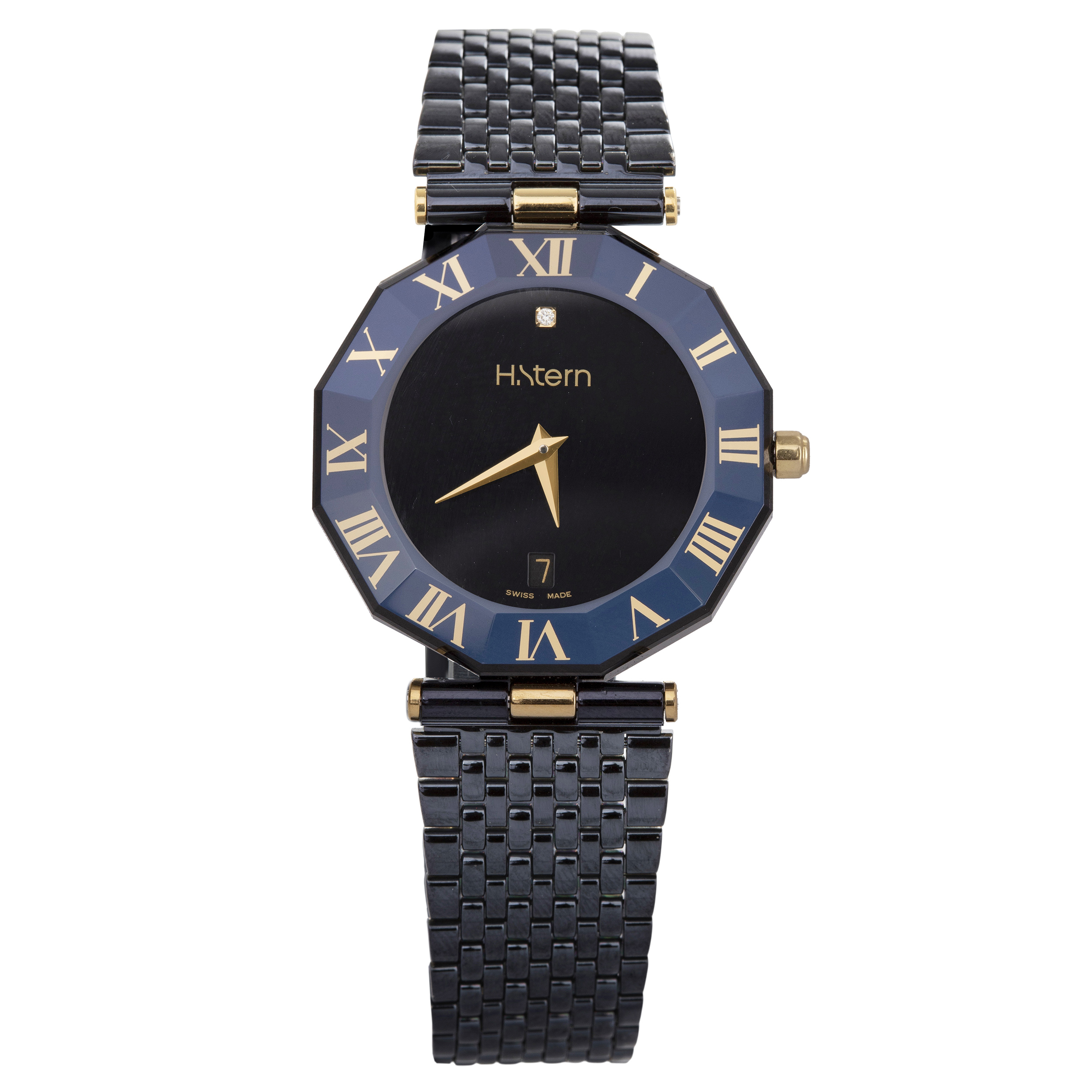 H.STERN. Relógio Coleçåo Safira com 0,01ct de brilhante, movimento a quartzo, calendário, vidro de safira, anos 2000. Caixa 34mm. Pulseira de aço 20cm.