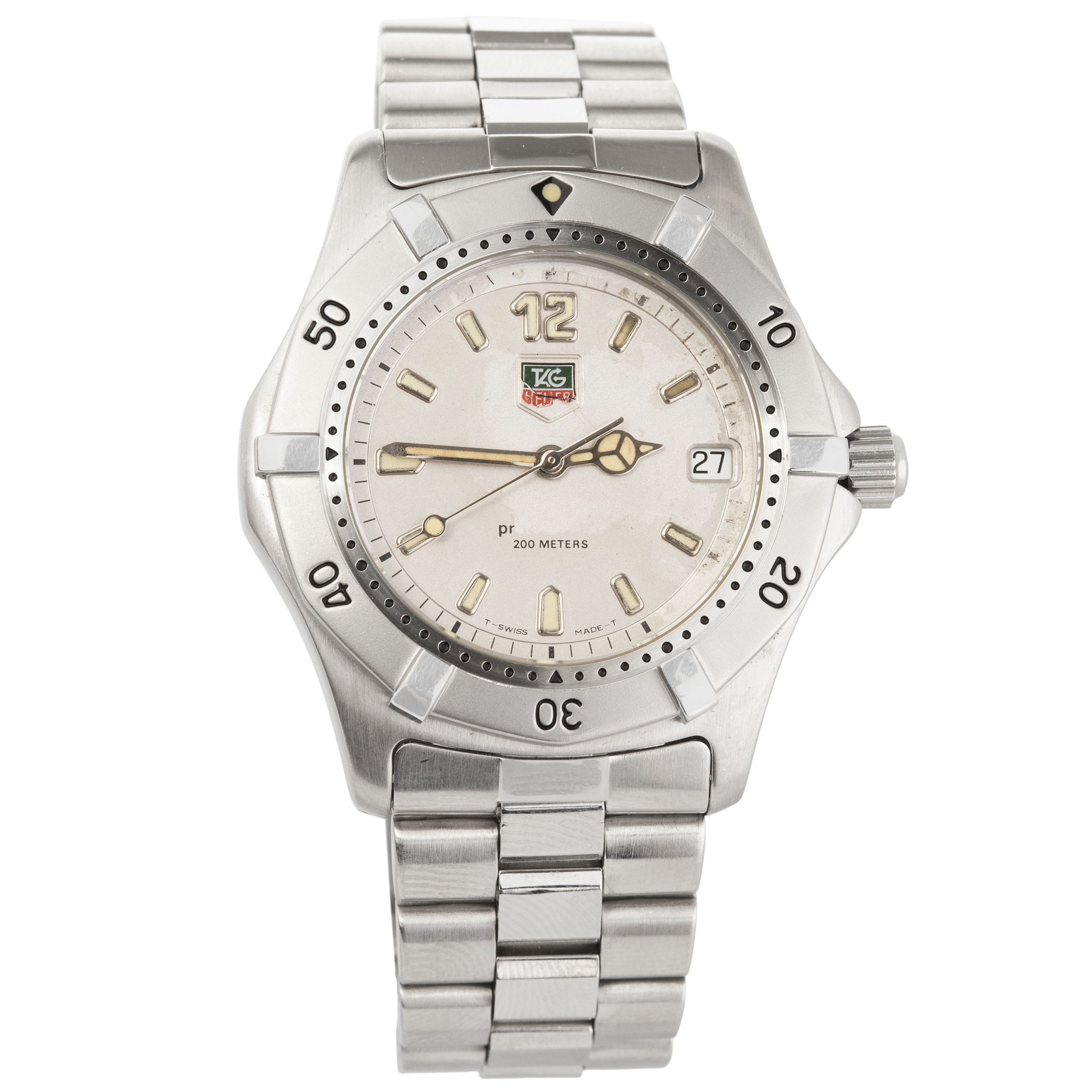 TAG HEUER. Relógio Professional de aço com mostrador com detalhes, movimento a quartzo, calendário, vidro de safira, anos 90. Com estojo original. Caixa 36mm. Pulseira 18cm.