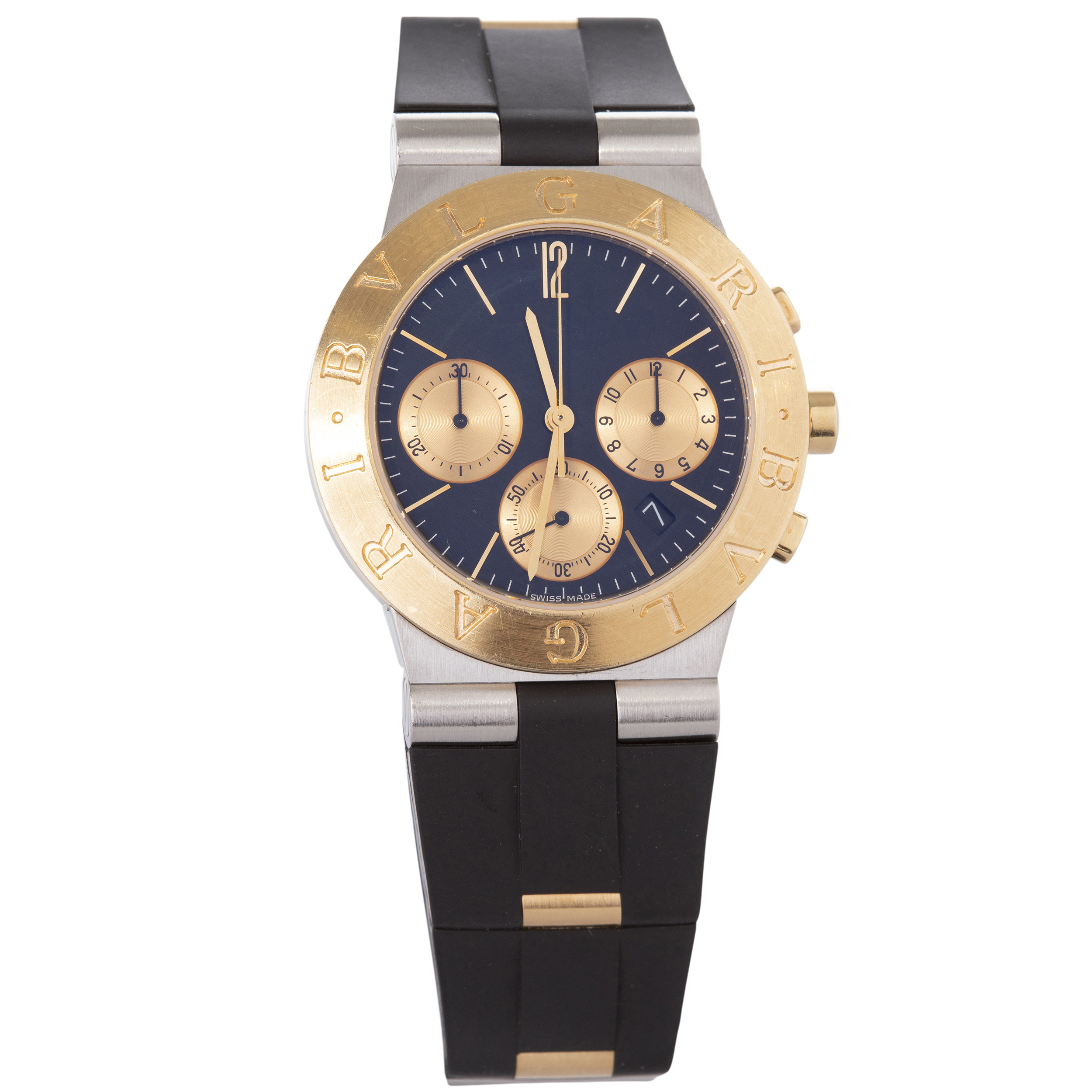 BVLGARI. Relógio Diagono de aço e ouro amarelo com movimento a quartzo, cronógrafo, calendário, vidro de safira, anos 90. Caixa 35mm. Pulseira de borracha 21cm.