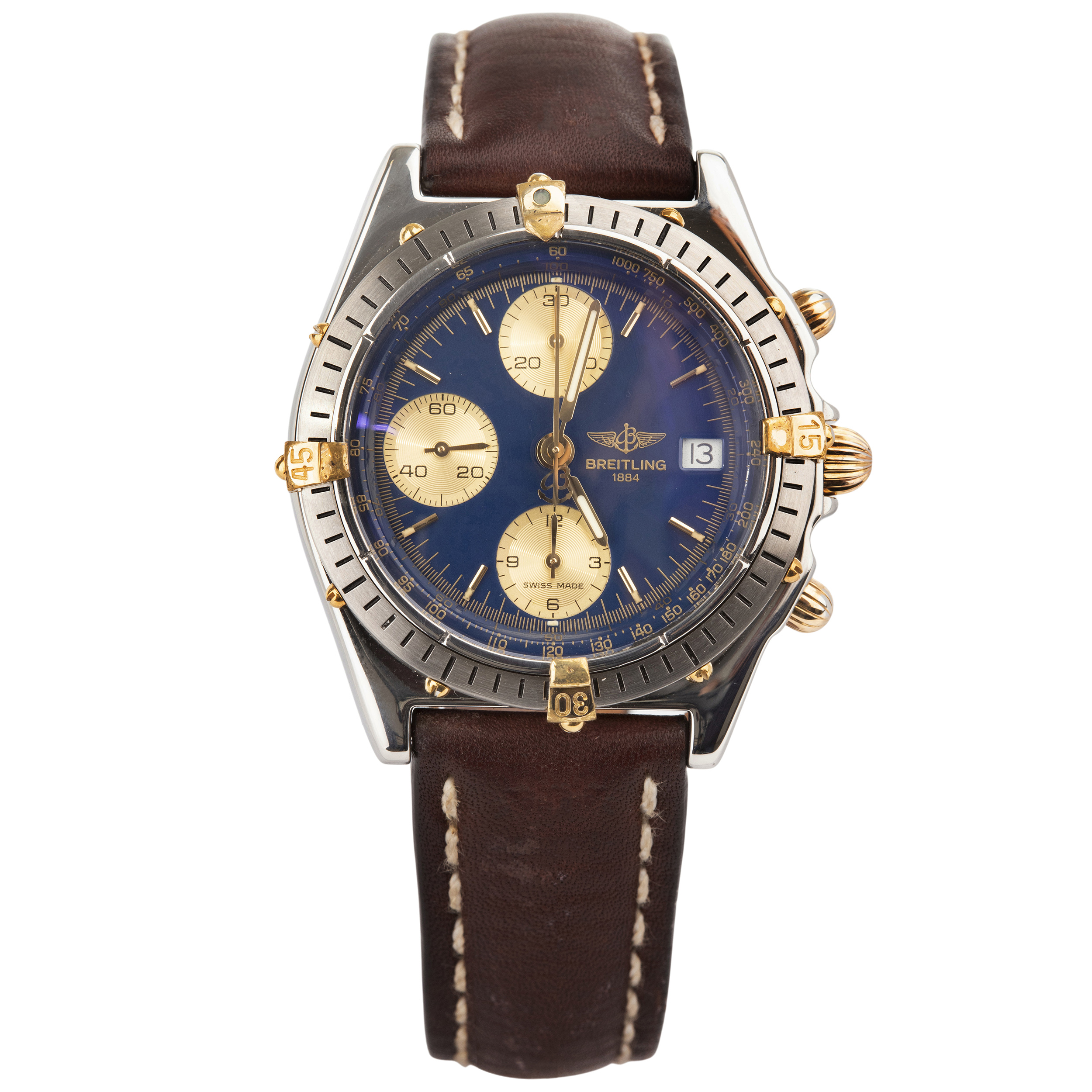 BREITLING. Relógio Chronomat de aço e plaqué de ouro amarelo com movimento automático, cronógrafo, calendário, vidro de safira, anos 90. Caixa 39mm. Pulseira de couro 21cm.