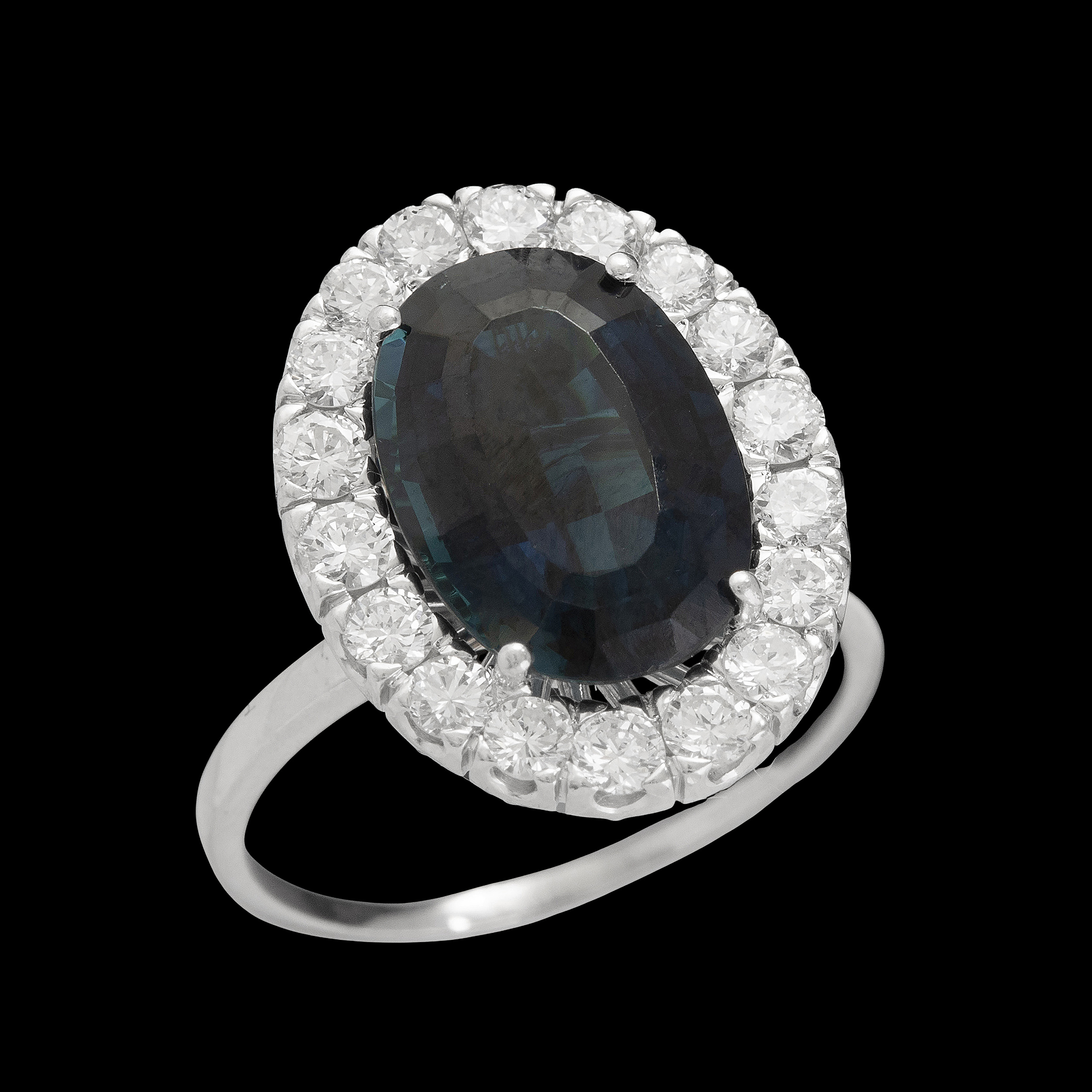 Anel de ouro branco com safiras, 0,50ct de brilhantes e 7,9g. Medida 16