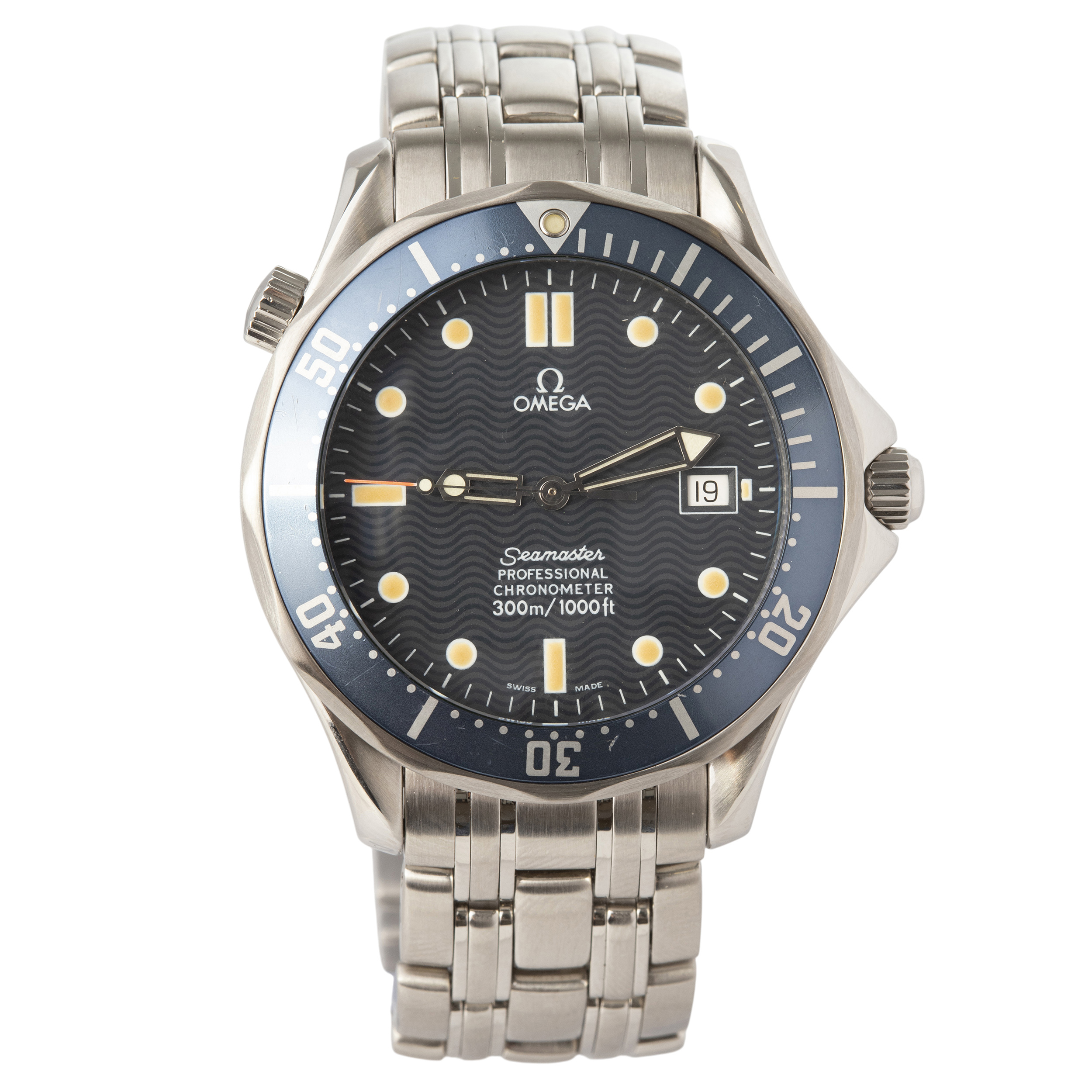 OMEGA. Relógio Seamaster 300m de aço com movimento automático, calendário, vidro de safira, anos 2000. Caixa 40mm. Pulseira 18,5cm.
