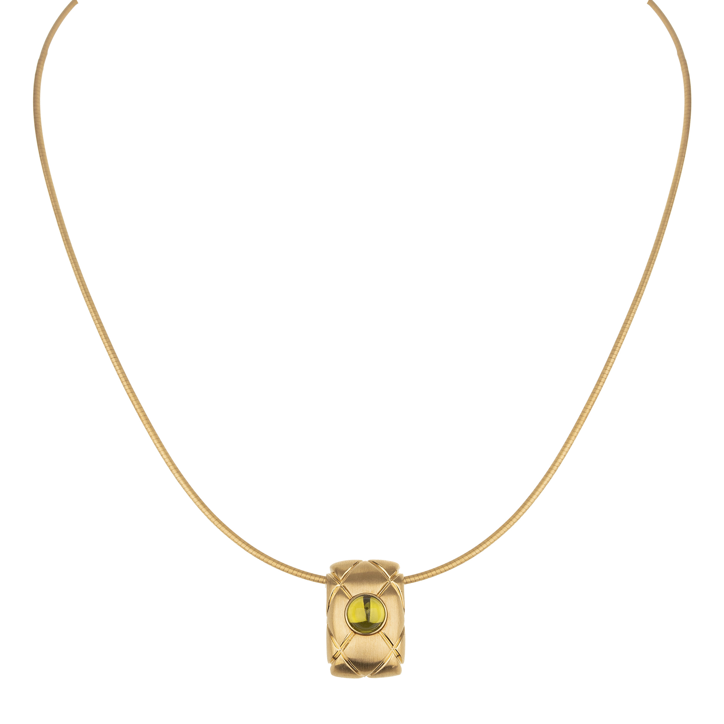 MONTBLANC. Gargantilha com pingente de ouro amarelo, peridoto e 21,0g. Medidas 2,1cm/42cm.