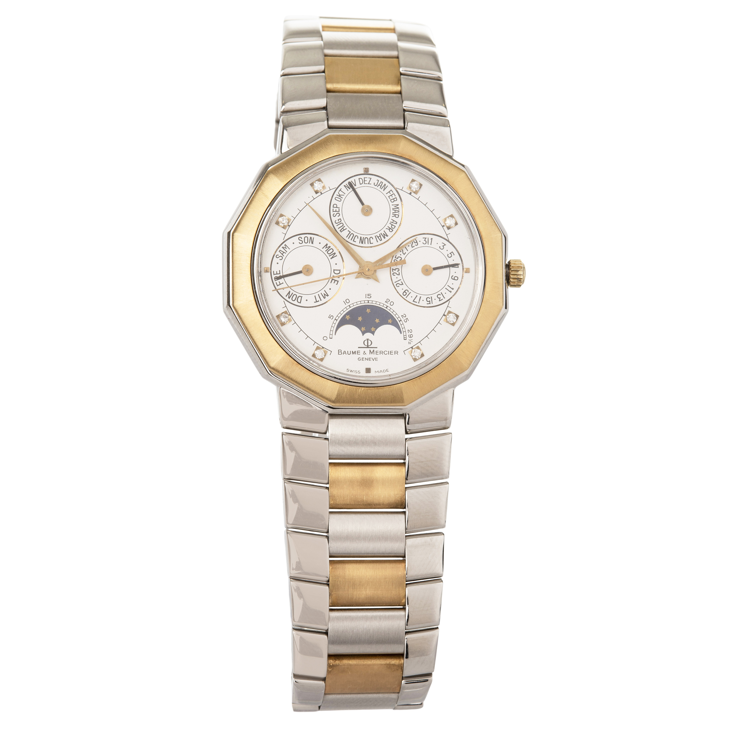 BAUME & MERCIER. Relógio Riviera de aço e ouro amarelo com movimento a quartzo, fases da lua, calendário, vidro de safira, ano 1988. Com estojo e certificado originais. Caixa 34mm. Pulseira 18cm.