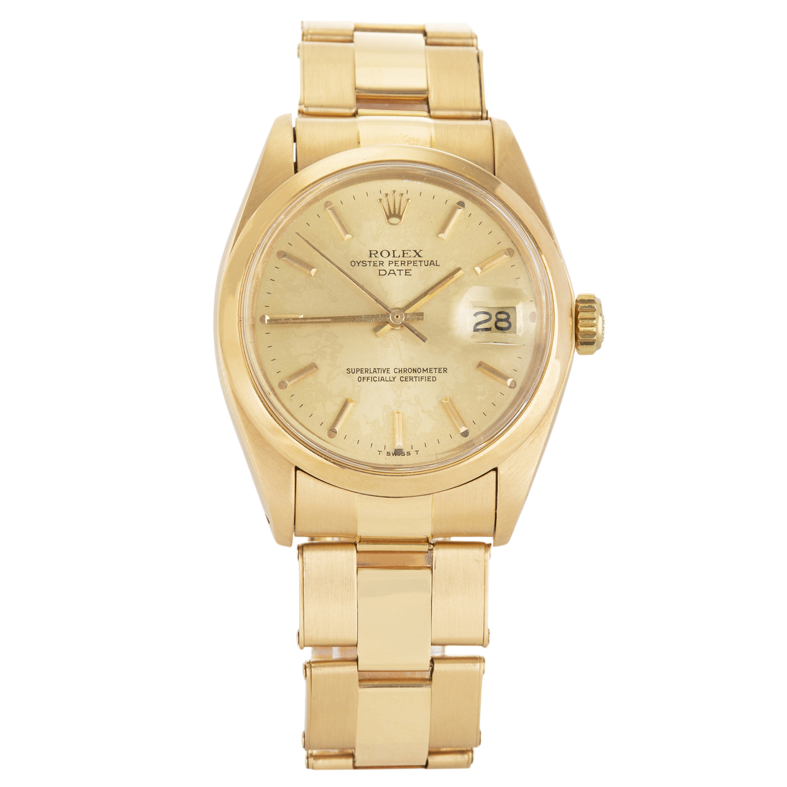 ROLEX. Relógio Datejust de ouro rosé com movimento automático, calendário, vidro de acrílico, ano 1977. Com estojo e certificado originais. Caixa 34mm. Pulseira oyster 21cm.