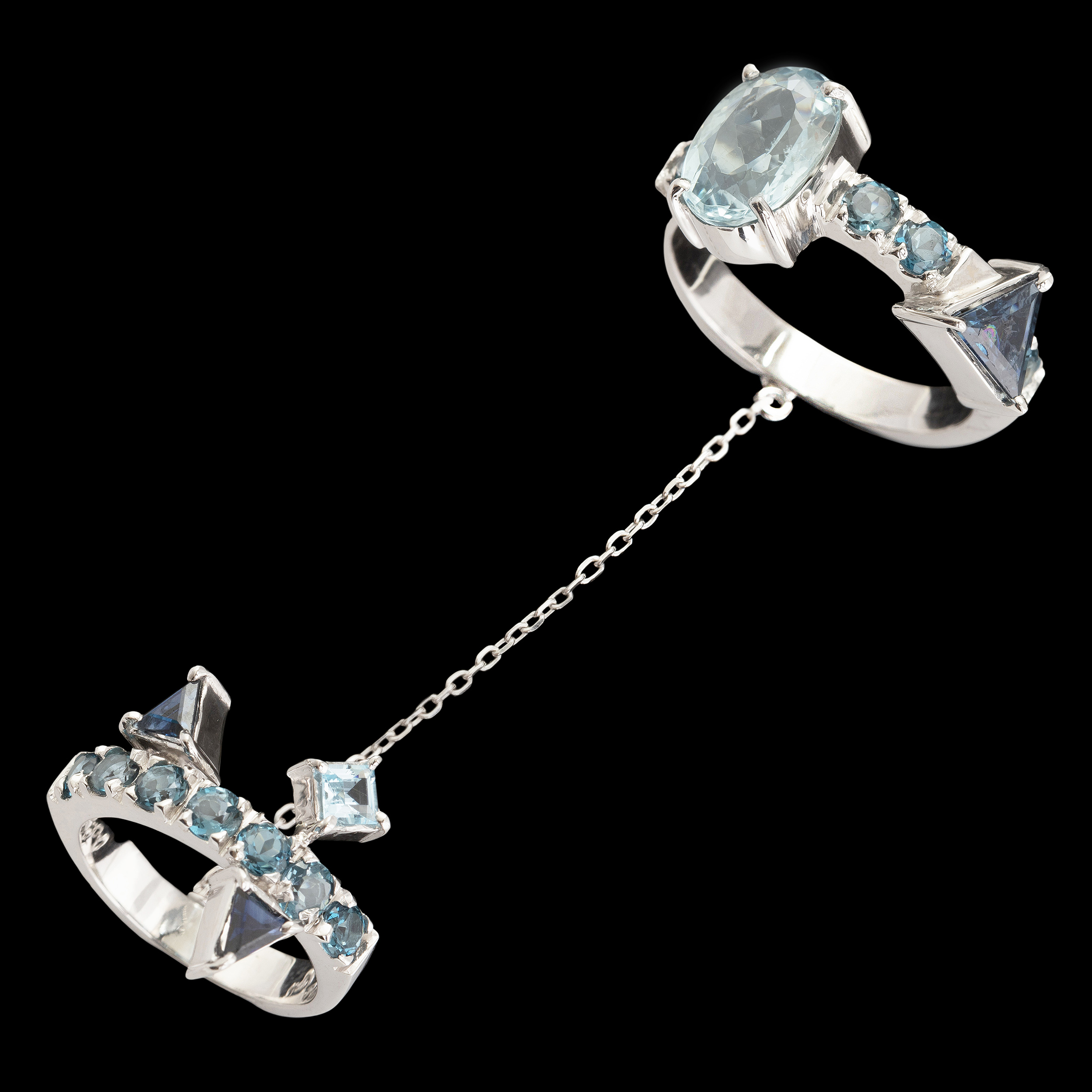 Anel duplo de ouro branco com safiras, águas-marinhas, topázios e 9,9g. Medidas 8/16.