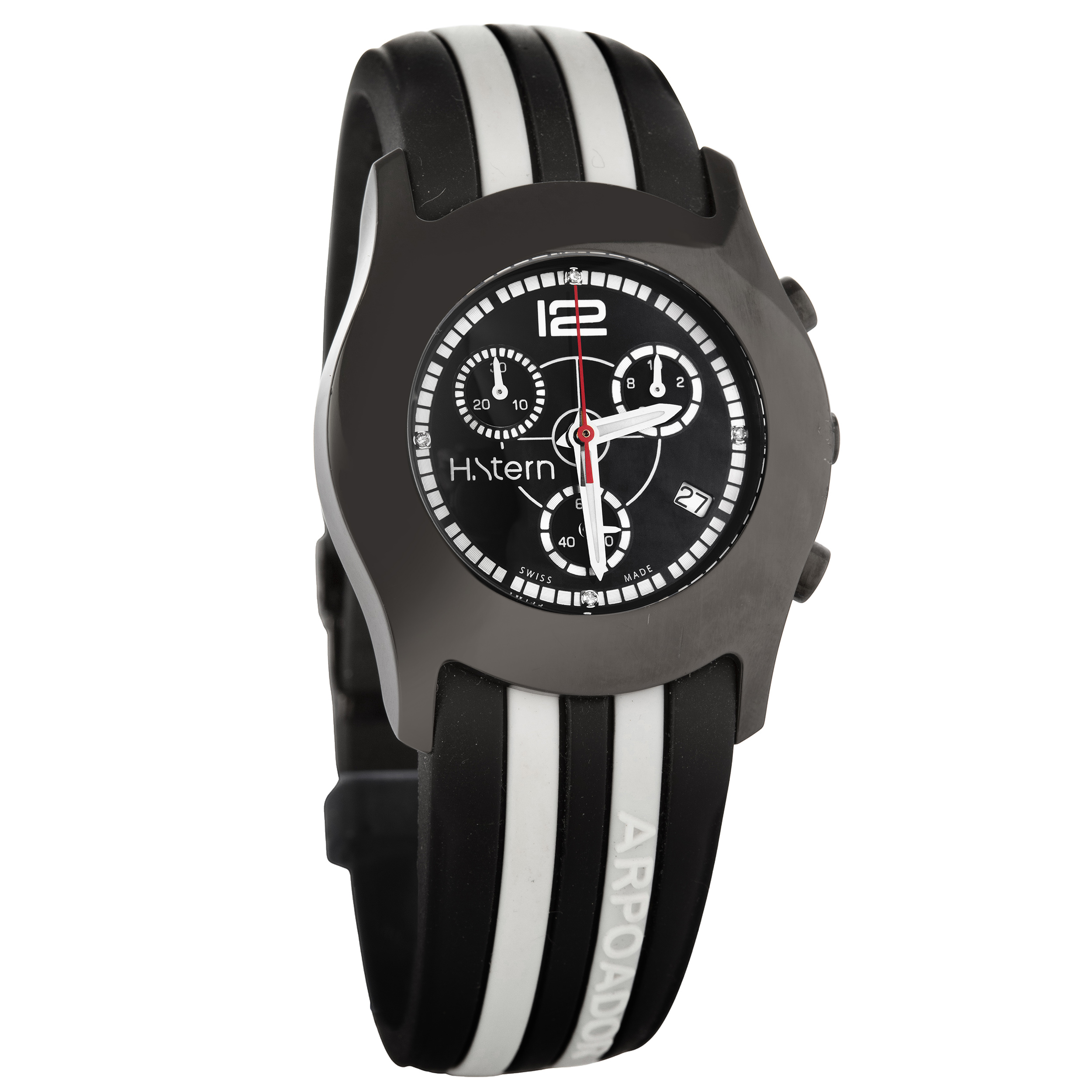 H. STERN. Relógio Arpoador de aço com detalhes, movimento quartzo, cronógrafo, calendário, vidro de safira, anos 90. Caixa 37mm. Pulseira de borracha 20cm.