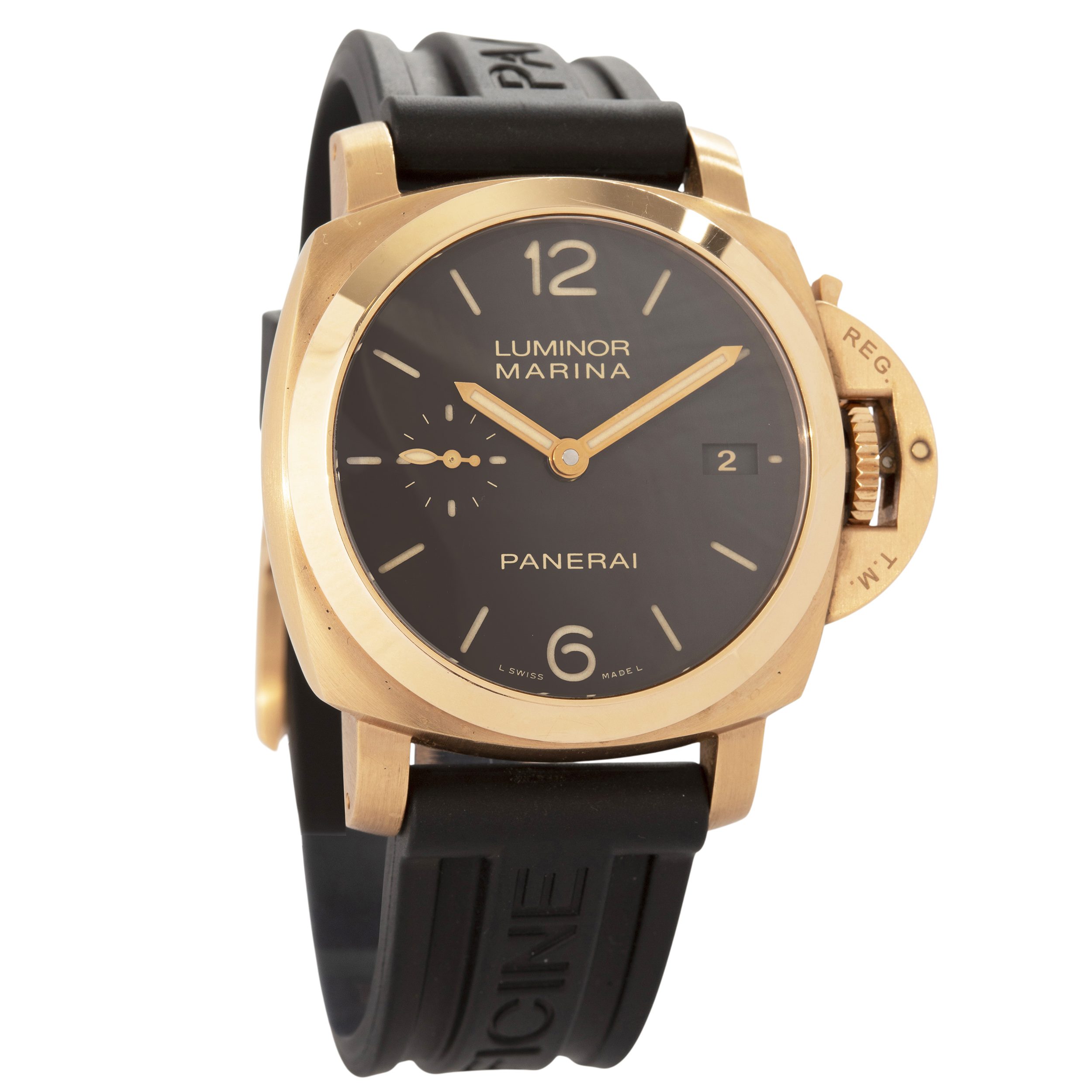 PANERAI. Relógio Luminor Marina de ouro rosé com movimento automático, calendário, vidro de safira, anos 2010. Com estojo original. Caixa 42mm. Pulseira de borracha 23cm.