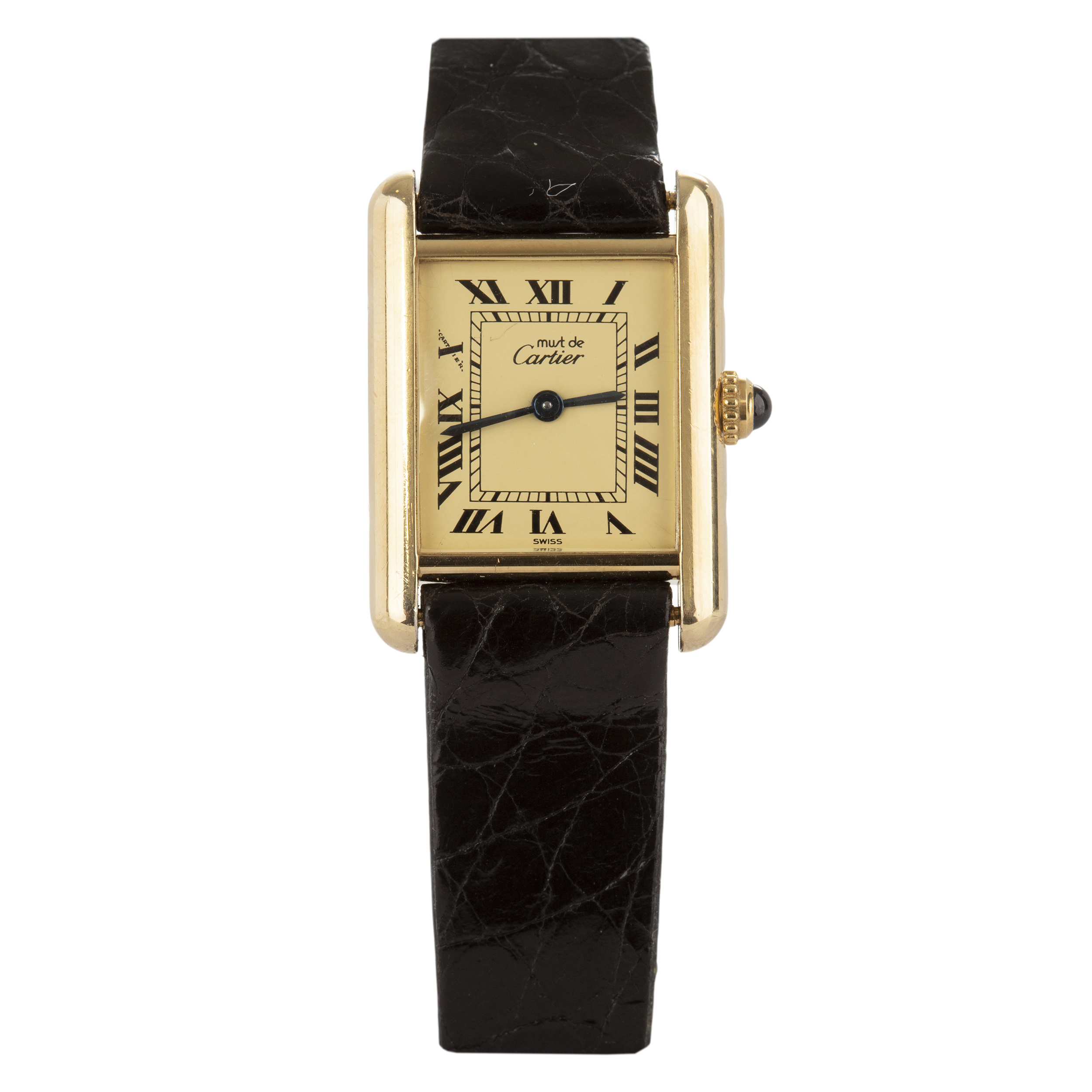 CARTIER. Relógio Tank Vermeil de plaqué de ouro amarelo com movimento a quartzo, vidro de safira, anos 90. Caixa 20x28mm. Pulseira de couro não original com fecho original 17cm.