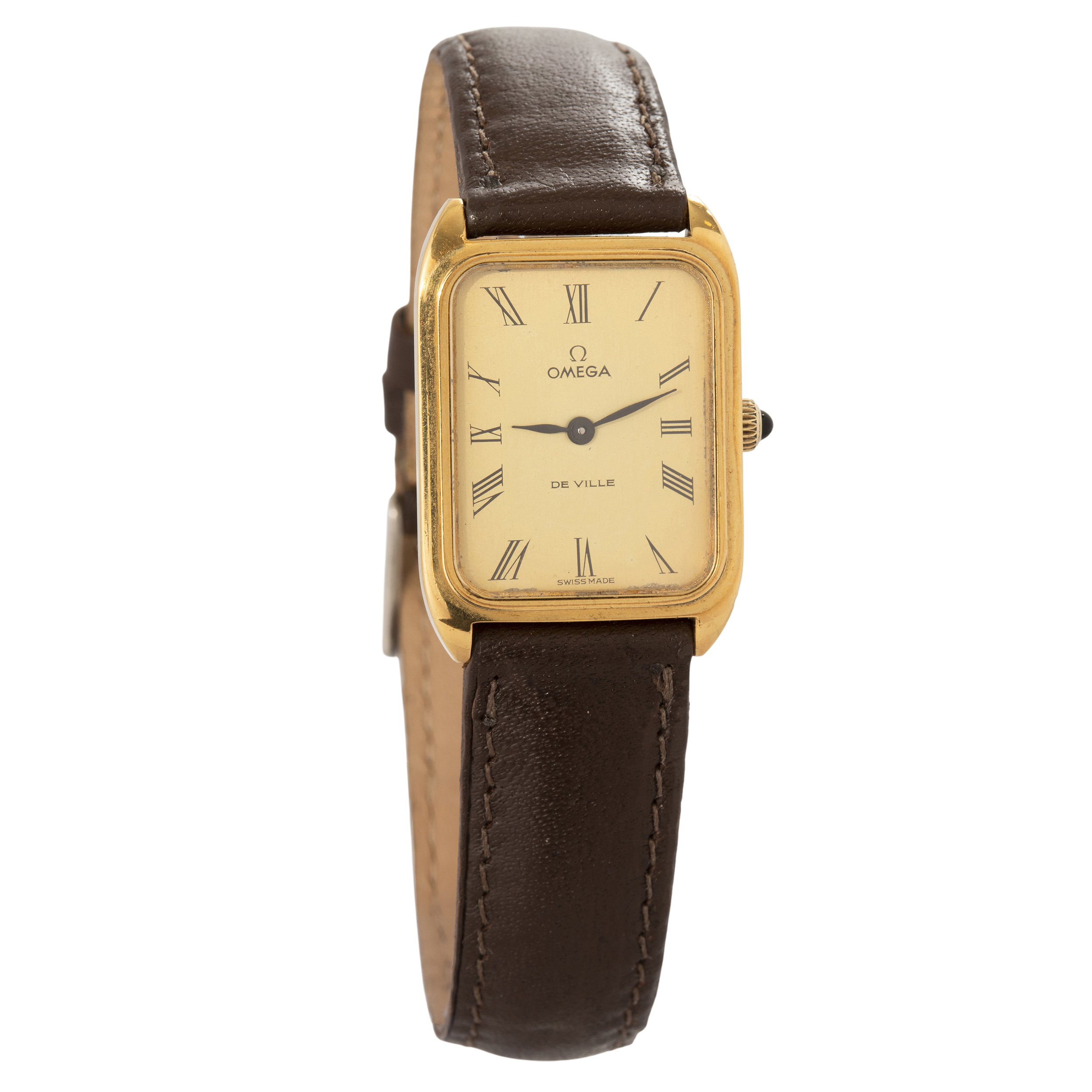 OMEGA. Relógio De Ville de plaqué de ouro amarelo com corda manual, vidro de cristal mineral, anos 70. Caixa 24x33mm. Pulseira de couro não original 20cm.