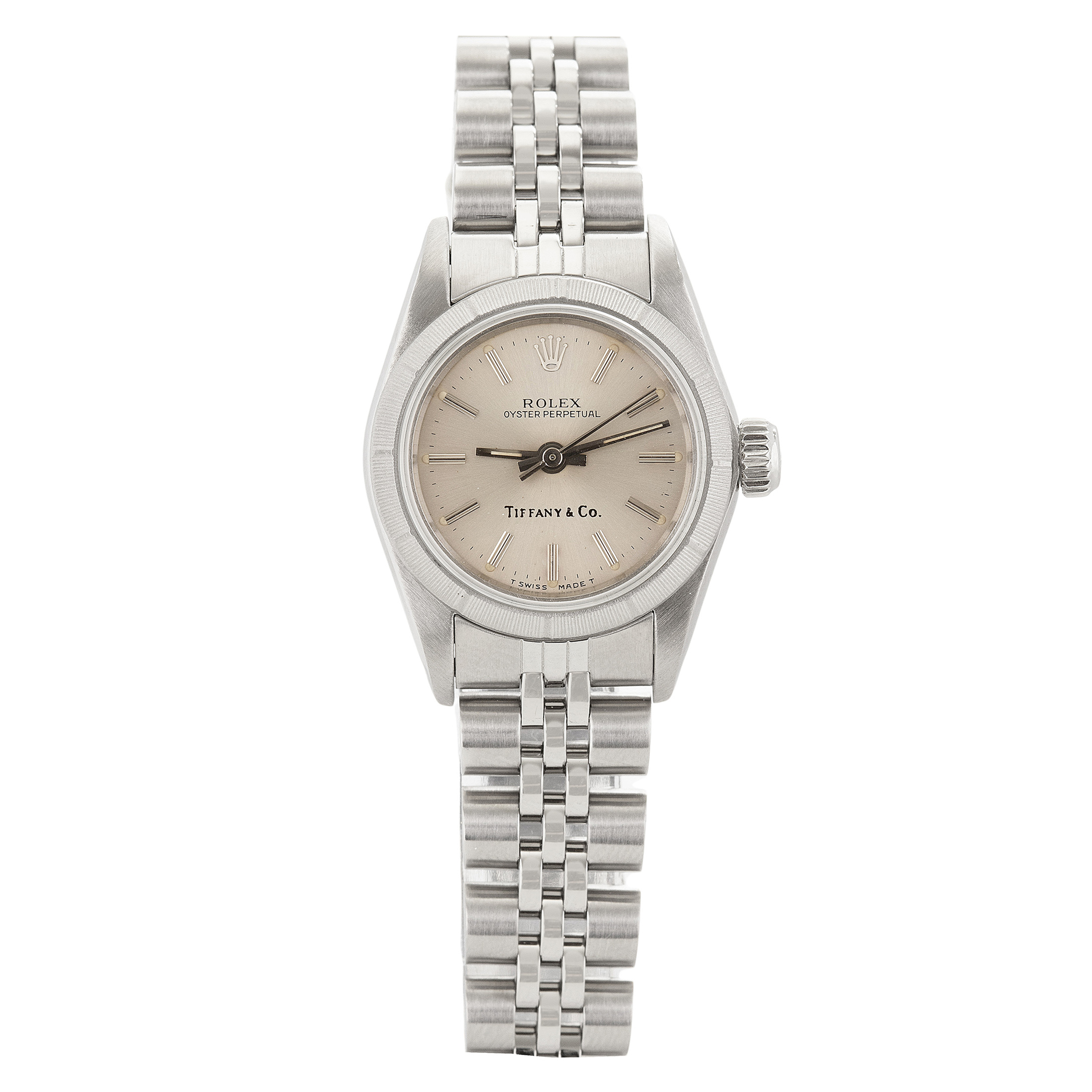 ROLEX. Relógio Oyster Perpetual Tiffany&Co de aço com movimento automático, vidro de safira, ano 1991. Com certificado original. Caixa 25mm. Pulseira jubileu 17,5cm.