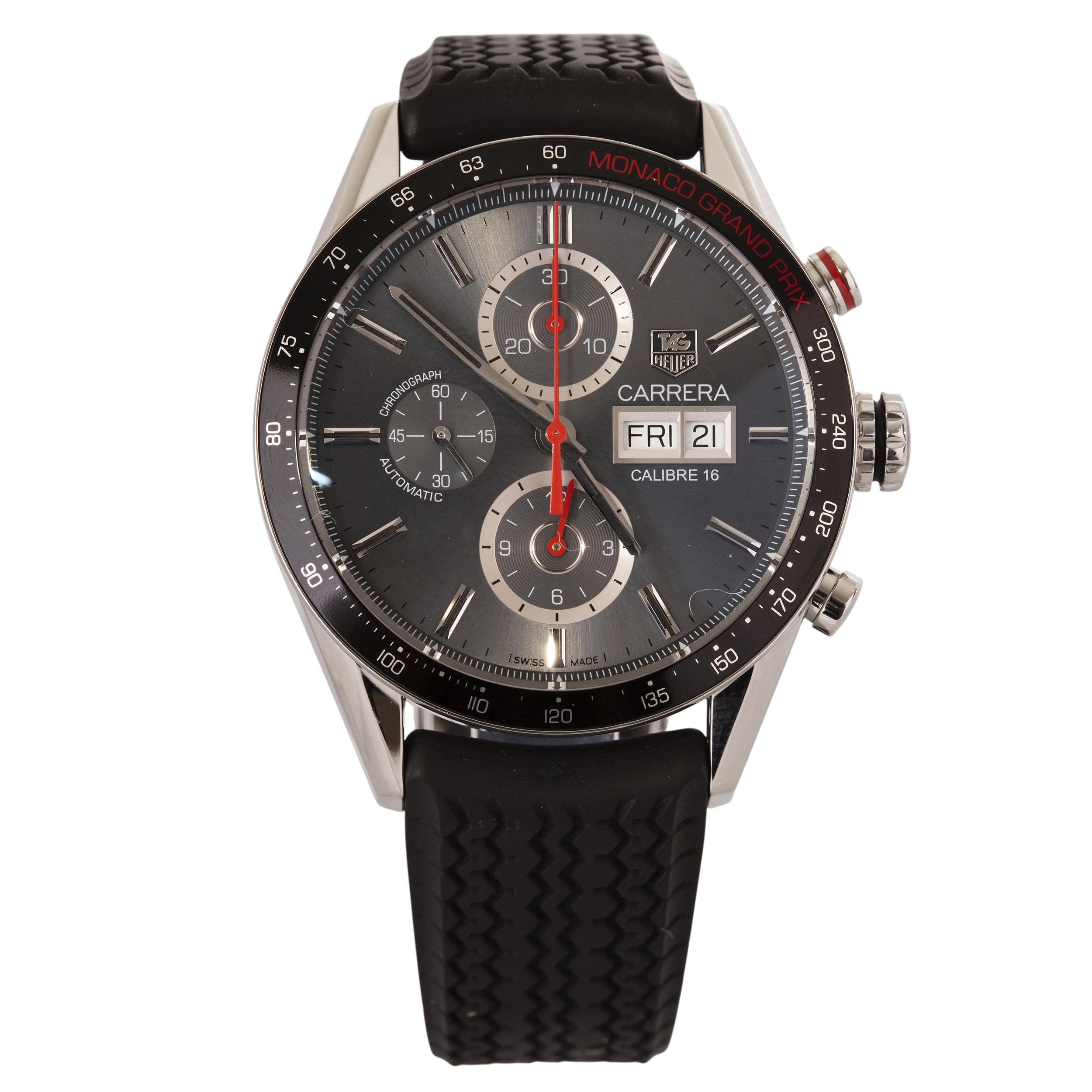 TAG HEUER. Relógio Carrera Monaco de aço com movimento automático, cronógrafo, calendário, vidro de safira, anos 2010. Caixa 43mm. Pulseira de borracha 22cm.