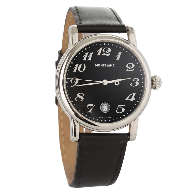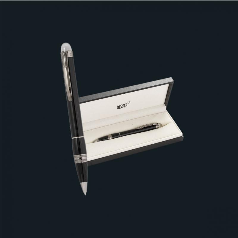 MONTBLANC. Caneta Starwalker esferográfica de resina preciosa com detalhes revestidos de reutênio e emblema flutuante. Com estojo original. Medida 13,6cm.