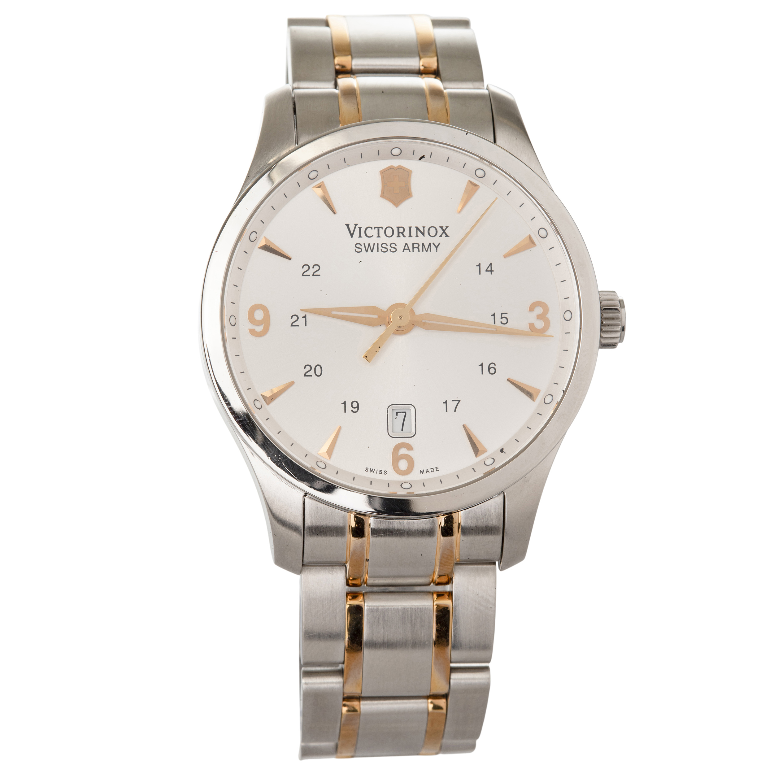 VICTORINOX. Relógio Alliance de aço e plaqué de ouro amarelo com movimento a quartzo, calendário, vidro de cristal mineral, ano 2012. Com estojo e certificado originais. Caixa 40mm. Pulseira 18cm.