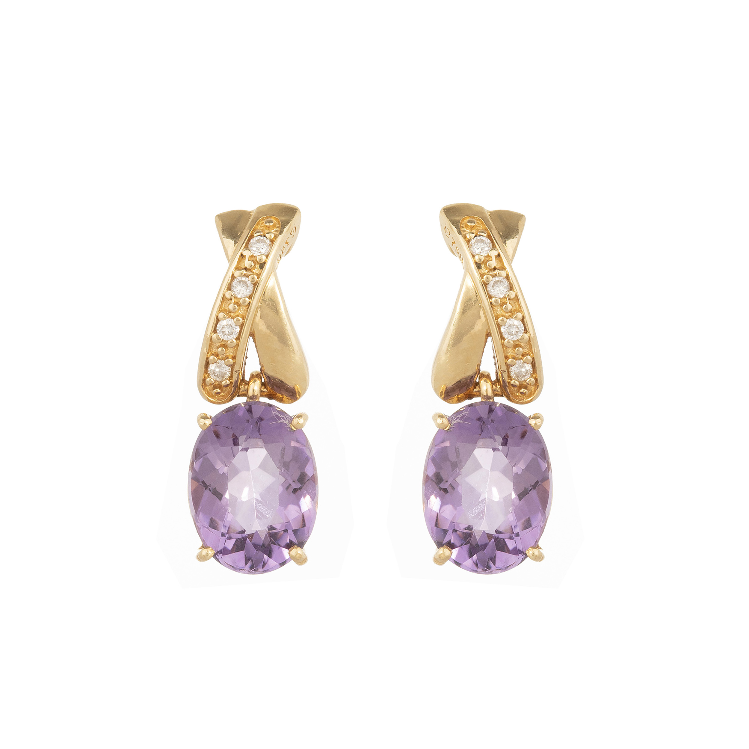 Brinco de ouro amarelo com ametistas e 0,03ct de brilhantes. Medida 1,7cm.