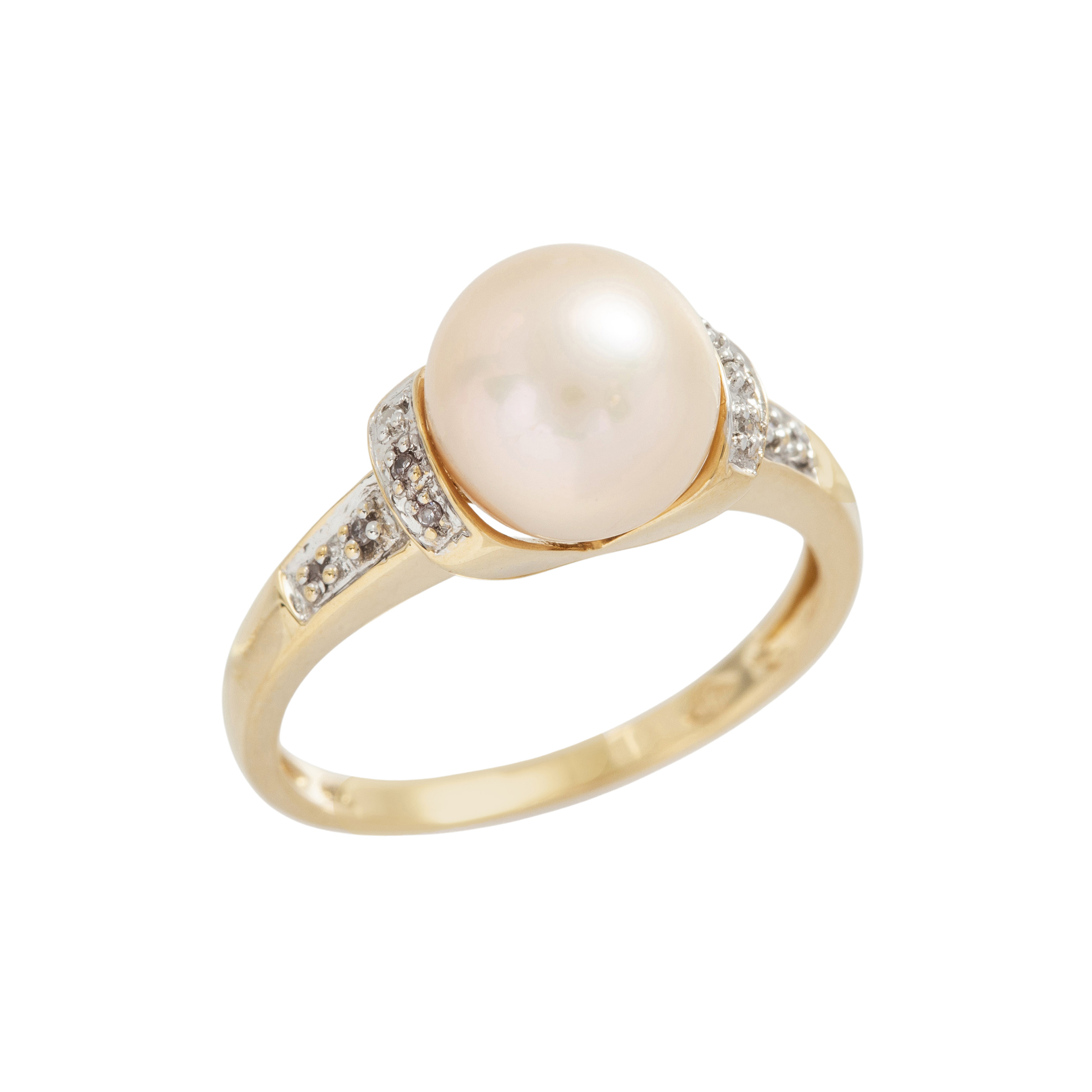 Anel de ouro amarelo com pérola (8,6mm) e 0,03ct de brilhantes. Medida 17.