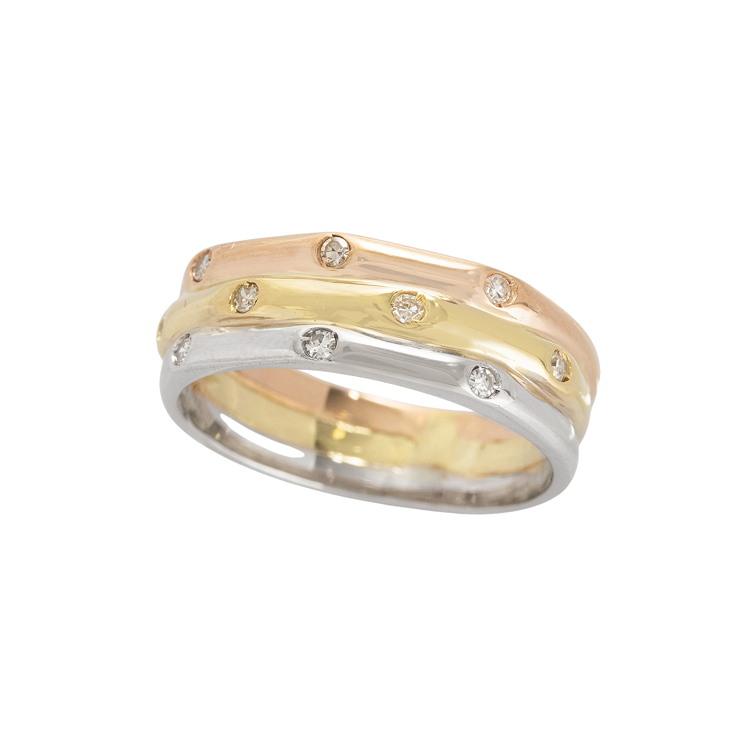 Anel de ouro amarelo, branco e rosé com 0,10ct de brilhantes. Medida 17.
