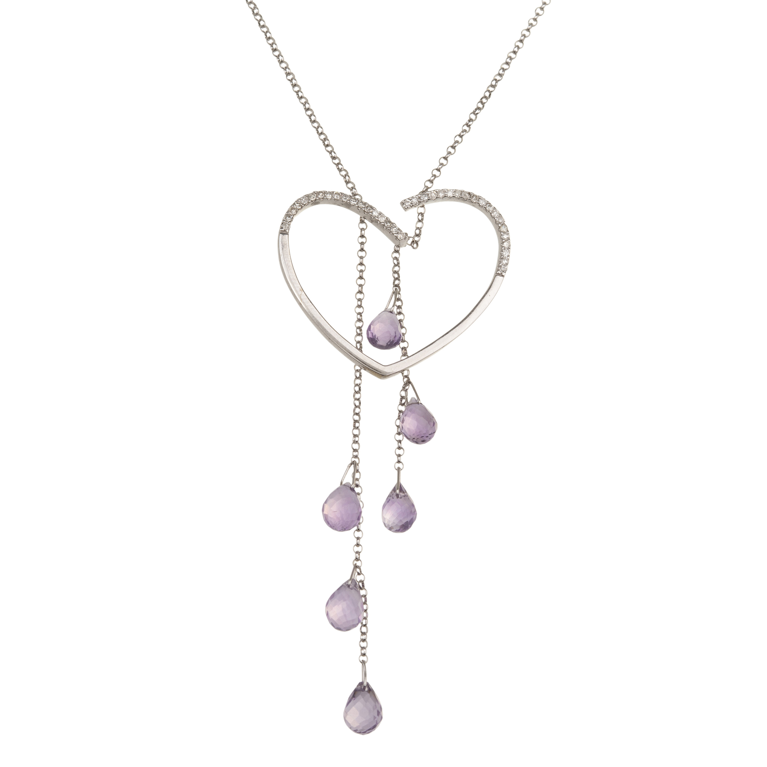 Corrente com pingente de ouro branco, ametistas e 0,18ct de brilhantes. Medidas 6,5cm/40cm.
