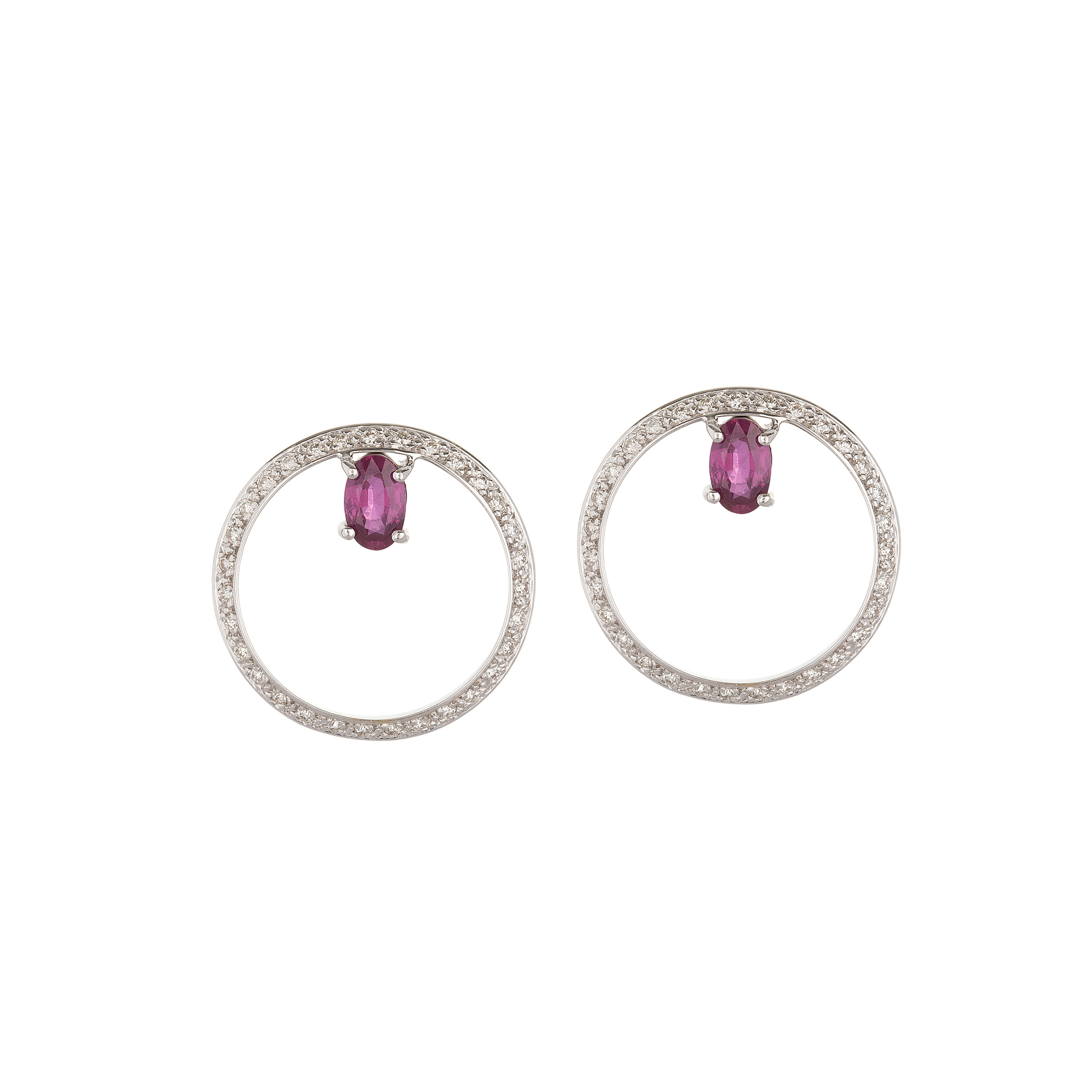Brinco de ouro branco com 0,70ct de turmalinas rosa e 0,25ct de brilhantes. Medida 2cm.
