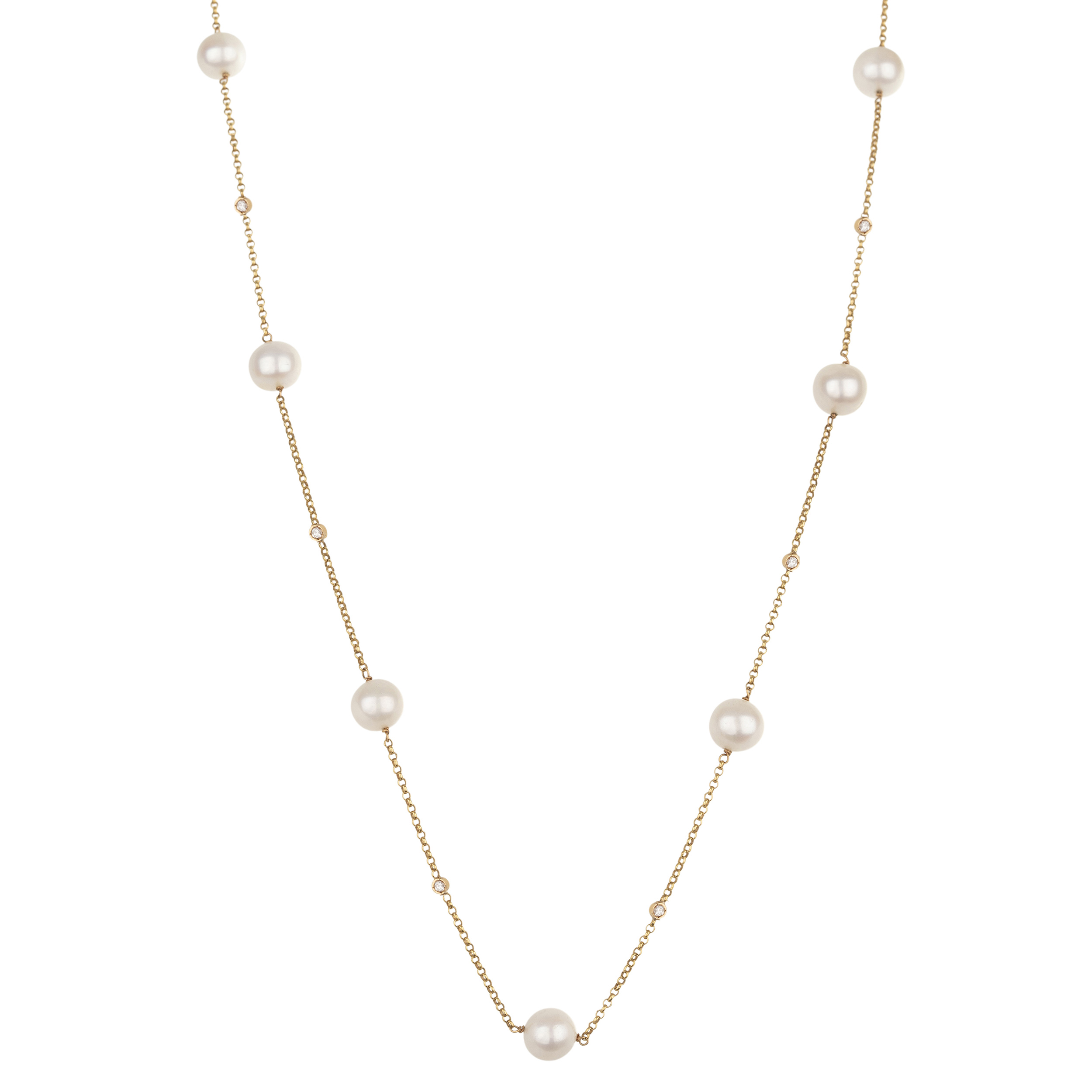 Corrente de ouro amarelo com pérolas (9,1mm), 0,25ct de brilhantes e 16,3g. Medida 62cm.