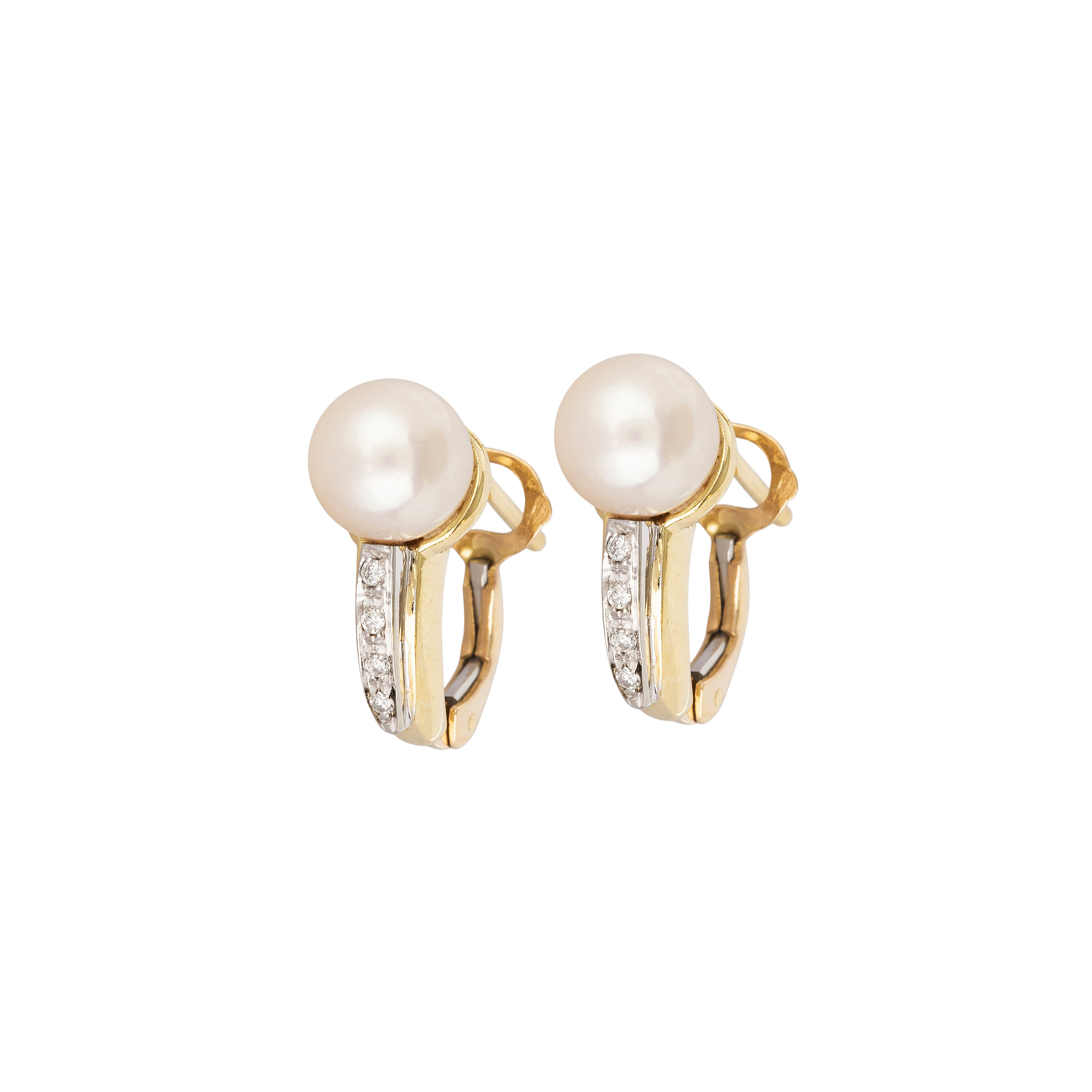 Brinco de ouro amarelo e branco com pérolas (7mm) e 0,05ct de brilhantes. Medida 1,5cm.