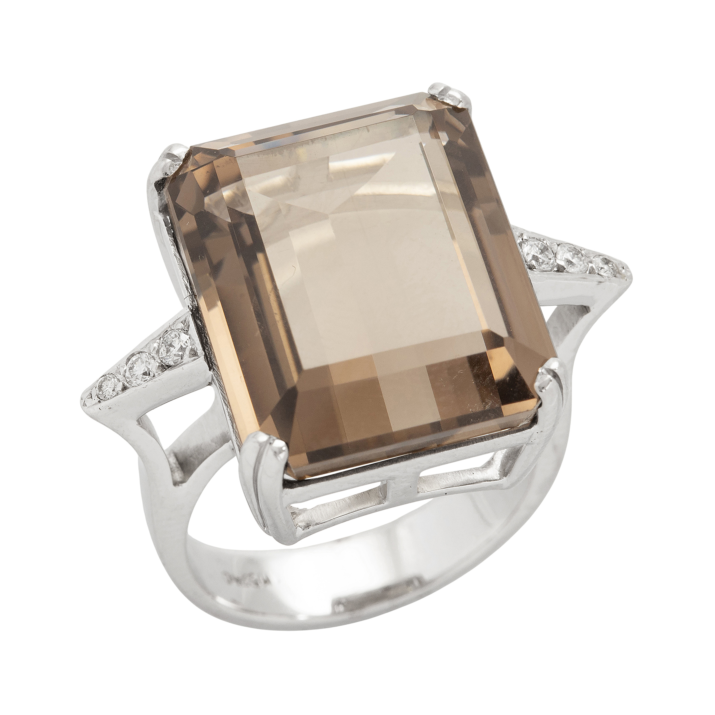 Anel de ouro branco com 21,00ct de quartzo fumê, 0,12ct de brilhantes e 12,9g. Medida 17.