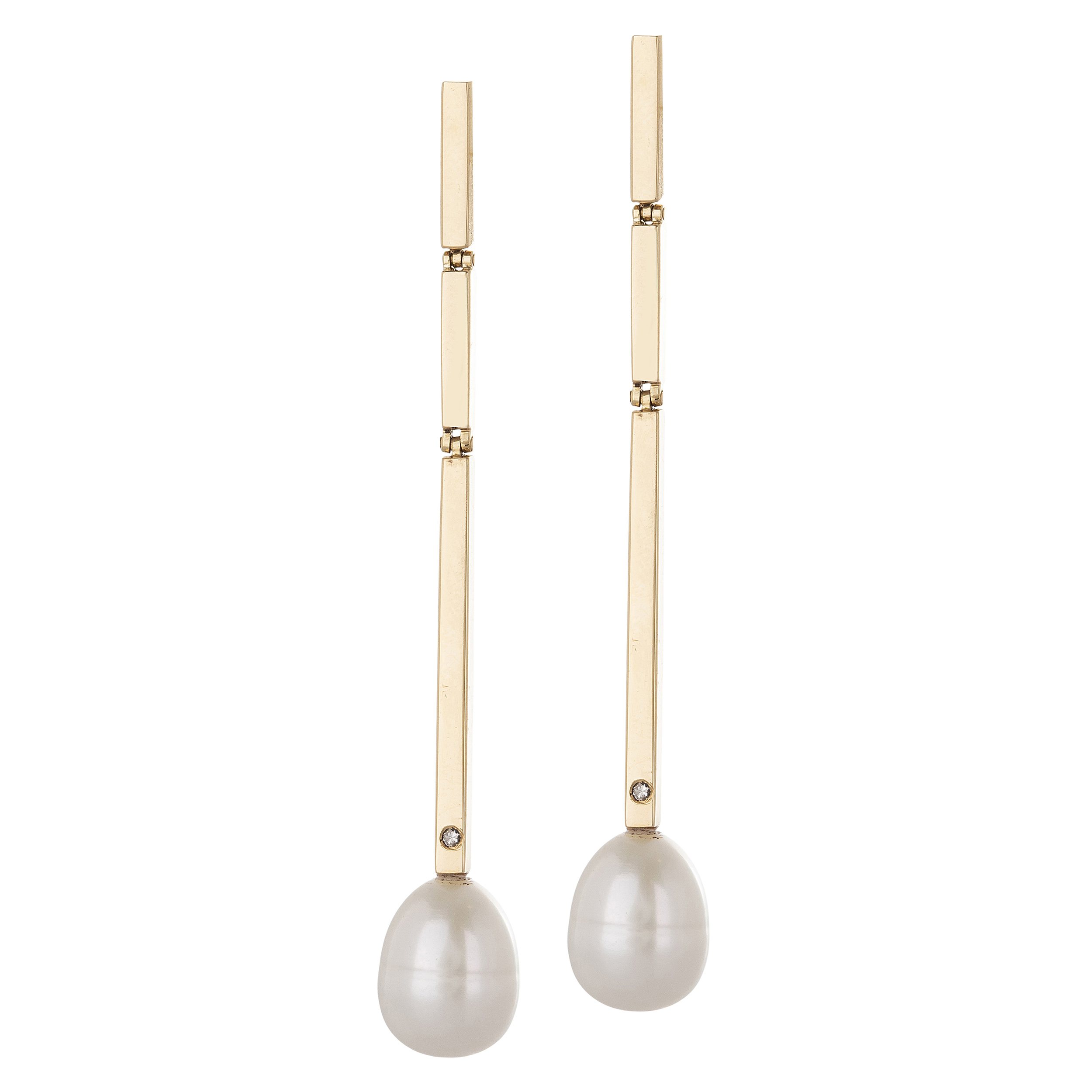 Brinco de ouro amarelo com pérolas (9,4mm), 0,02ct de brilhantes e 8,7g. Medida 6,5cm.