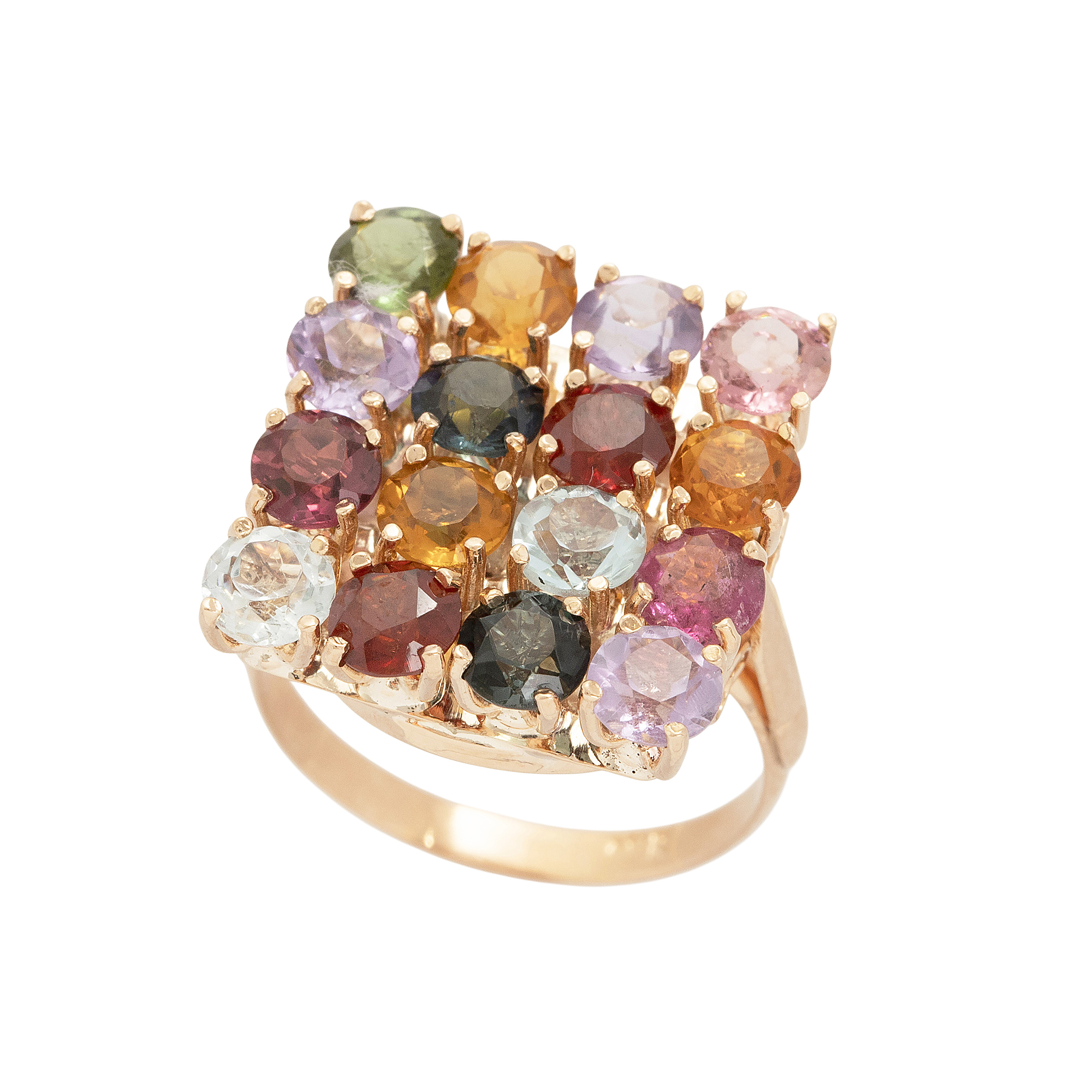 Anel de ouro rosé com peridotos, citrinos, ametistas, turmalinas rosa, topázios e granadas. Medida 14.