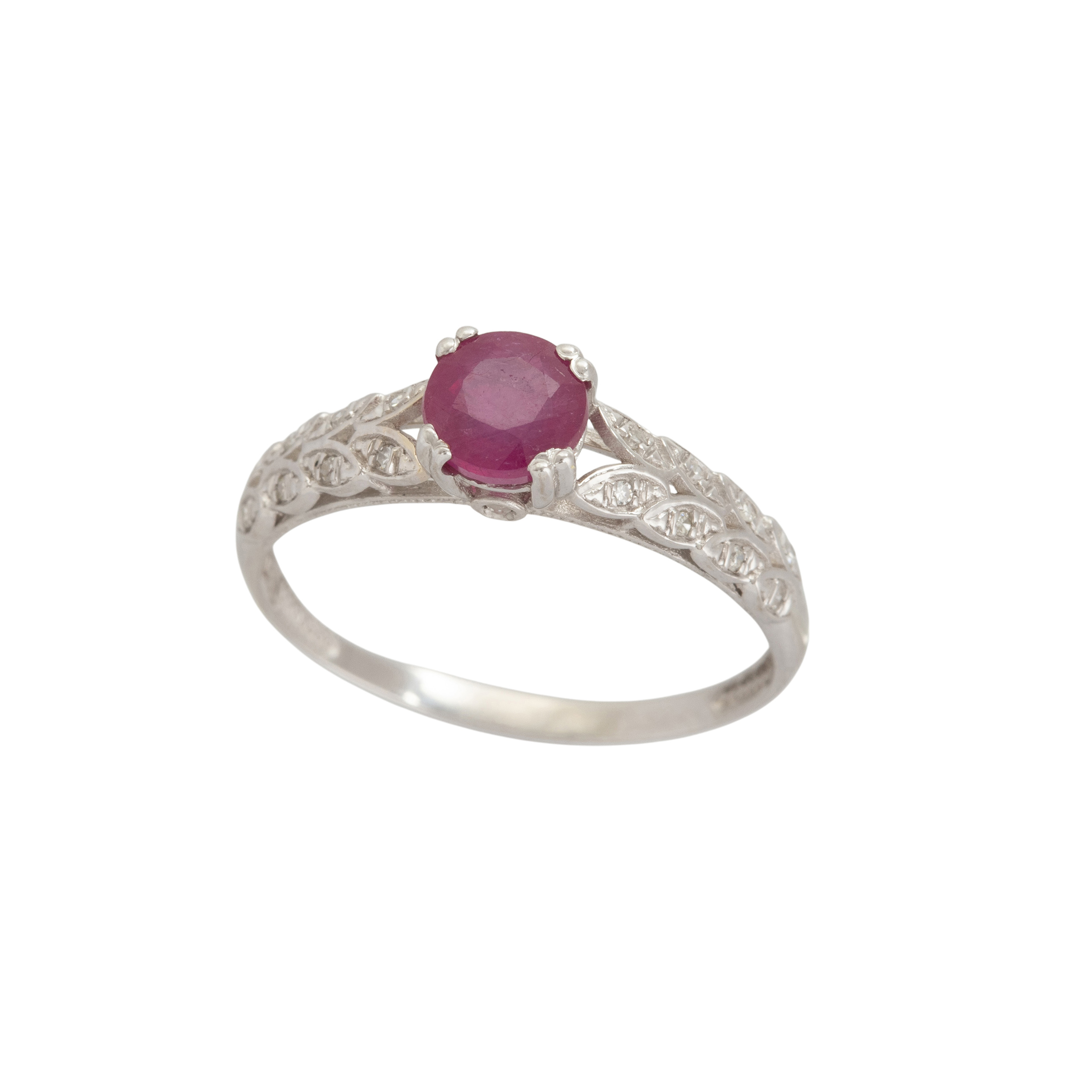 Anel de ouro branco com 1,10ct de rubi e 0,09ct de brilhantes. Medida 24.