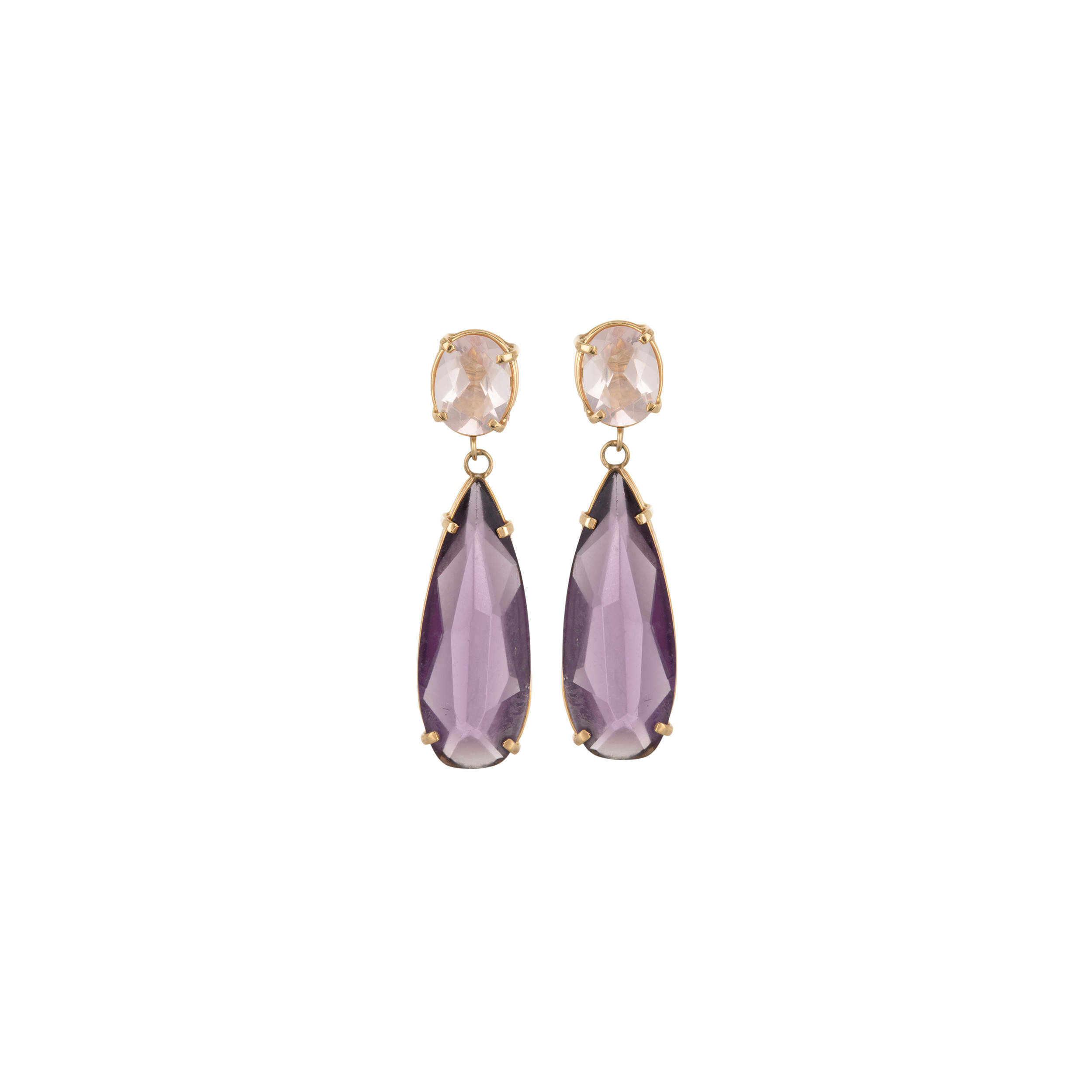 Brinco de ouro amarelo com quartzos rosa, ametistas e 6,0g. Medida 3,5cm.