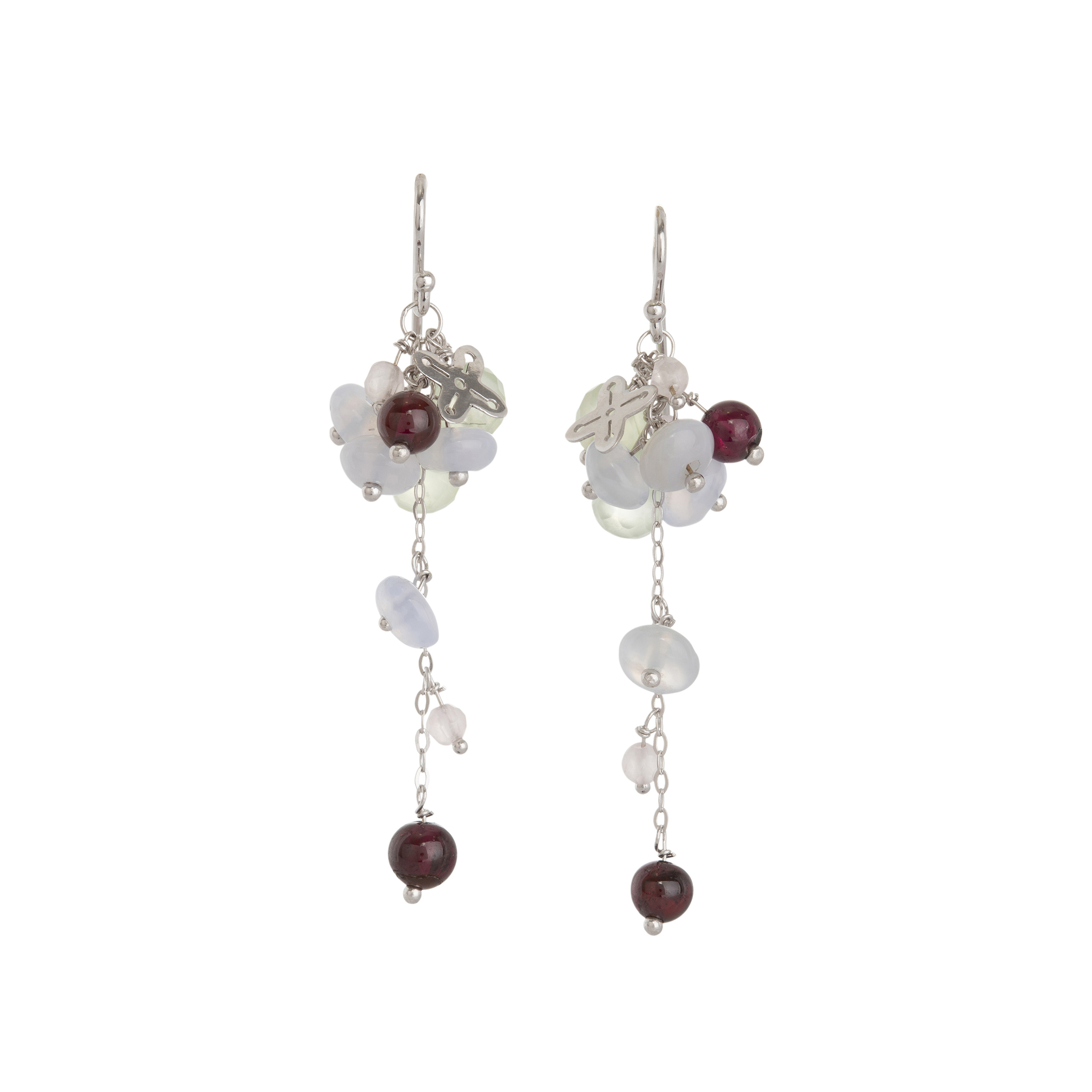 Brinco de ouro branco com peridotos, rubelitas, quartzos e pedras da lua. Medida 5,4cm.